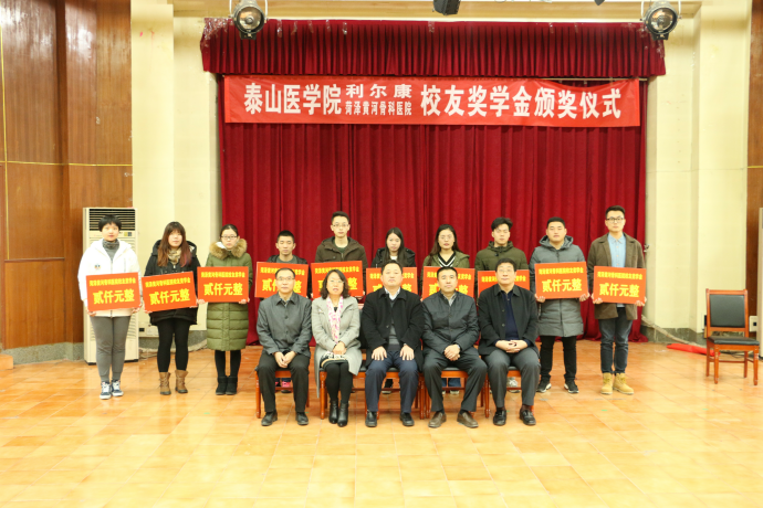 12月12日上午,由我校校友朱汉泉、张振洞设立的“利尔康校友奖学金”和“菏泽黄河骨科医院校友奖学金”颁奖仪式在天外村校区视听中心举行,副院长彭春雷出席仪式并讲话。