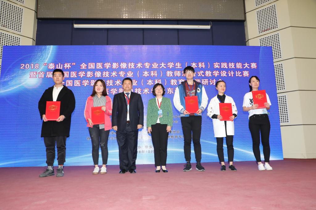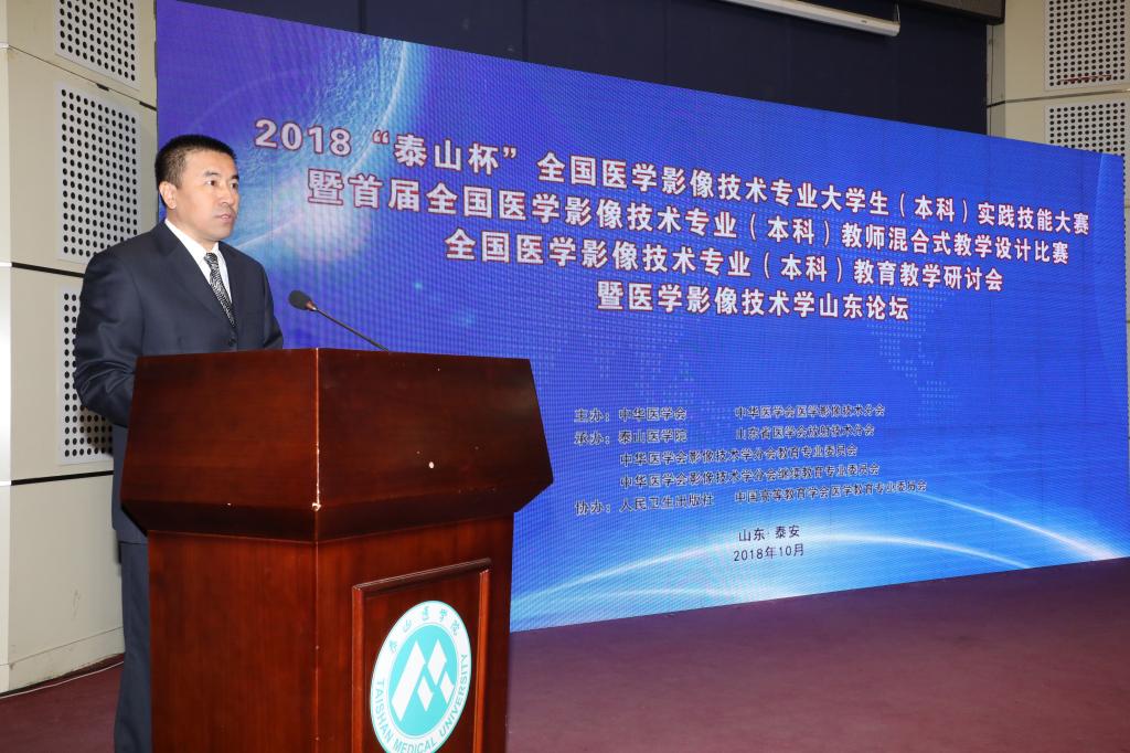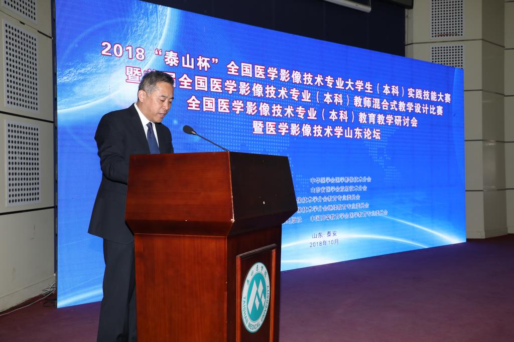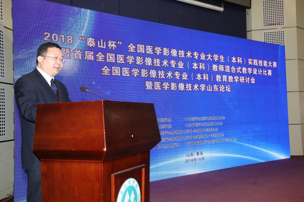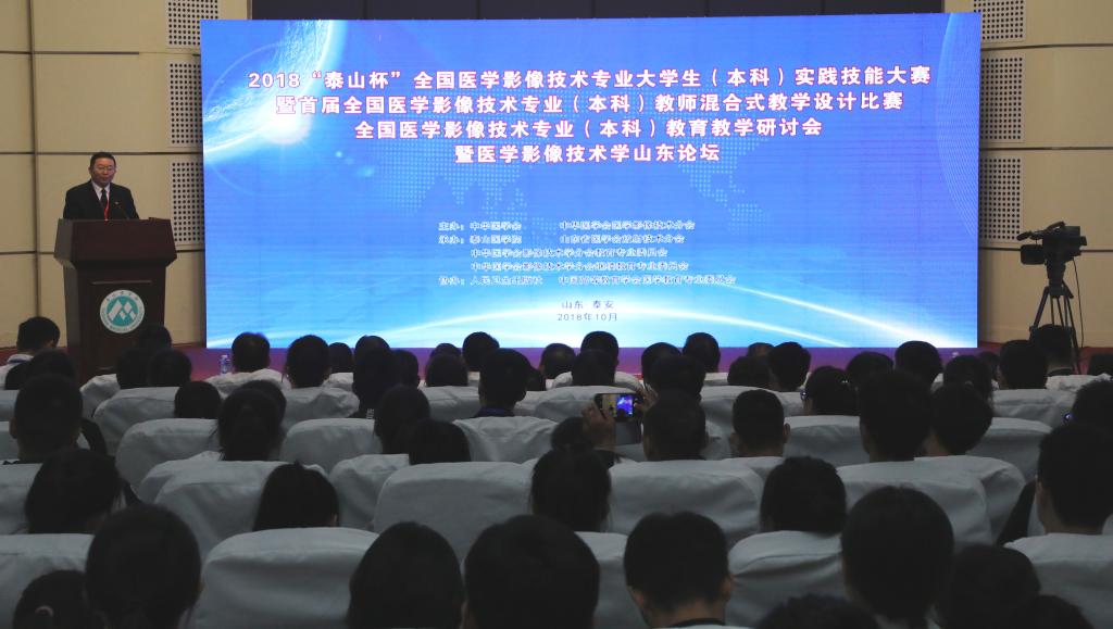 为聚焦本科教育“两个根本”,推进本科教育“回归常识,回归本分”,提升高等院校医学影像技术专业实践教学水平,激励广大教师提升专业技能,促进院校间交流合作,10月12至14日,由中华医学会、中华医学会影像技术学分会主办,泰山医学院、山东省医学会放射技术分会承办,人民卫生出版社、中国高等教育学会医学教育专委会协办的2018“泰山杯”医学影像技术专业大学生(本科)实践技能大赛暨首届医学影像技术专业(本科)教师混合式教学设计比赛,医学影像技术专业(本科)教育教学研讨会暨医学影像技术山东论坛在我校举办。