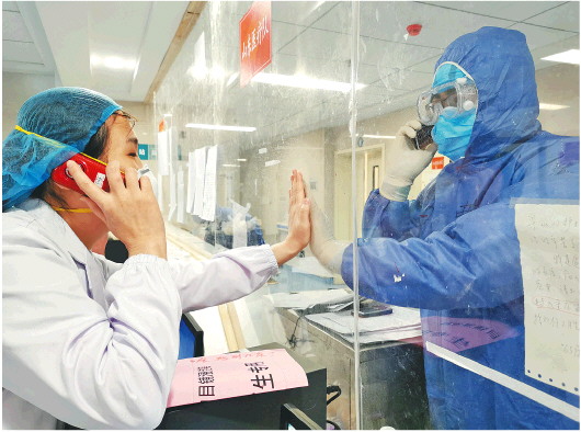 他乡遇故知,虽然近在咫尺,可疫情当前,身处隔离病房,也只能以这种特有的方式彼此问候。一层厚厚的防护玻璃,隔断了声音、隔开了空间,却隔不去熟悉的身影,隔不断人间的真情——因疫情增加的人与人之间的物理距离,却让彼此的心靠得更近。