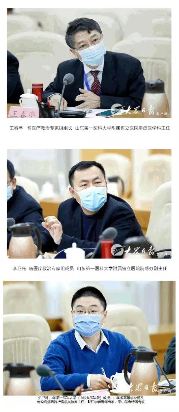 2月6日下午,省委书记、省新型冠状病毒感染肺炎疫情处置工作领导小组组长刘家义主持召开疫情防控工作专家座谈会,研判分析当前我省疫情防控形势,听取医疗防疫专家意见建议,部署推动下一步防控工作。省领导王书坚、孙立成、孙继业,省直有关部门负责同志参加座谈会。省医疗救治专家组组长、山东第一医科大学附属省立医院重症医学科主任王春亭,省医疗救治专家组成员、山东第一医科大学附属省立医院院感办副主任李卫光,山东第一医科大学(山东省医科院)教授史卫峰应邀参加。