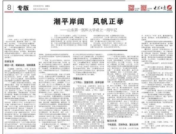2020年2月28日,是山东第一医科大学(山东省医学科学院)成立一周年。一年来,崭新的山东第一医科大学(山东省医学科学院)不忘初心、牢记使命,坚持党建引领,坚持“在山东,为山东”,坚持把大学和医院办在人民群众中,深化科教融合改革,各项工作全面起势,取得阶段性成果,为健康山东和新时代现代化强省建设作出了应有贡献。不忘来路,方能阔步前行。今天,《大众日报》推出专题文章《潮平岸阔 风帆正举》,回顾校(院)一年来各项事业的发展成就,进一步鼓足干劲,凝聚力量,携手开创2020年新的篇章。