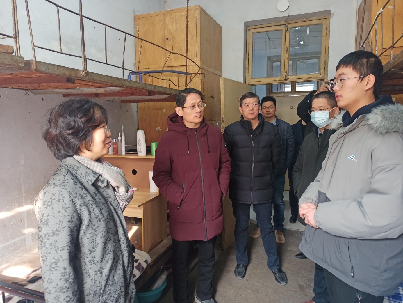 针对寒假假期的学生公寓管理工作,吕晓黎听取了学生工作部负责同志就寒假学生住宿情况的汇报,实地查看了学生公寓值班记录、学生出入及住宿登记表、门禁应用、人脸识别系统、常态化疫情防控等情况,并就相关问题与工作人员进行了交流。她对学生公寓管理工作表示肯定,叮嘱值班人员要坚守责任,建好台账,摸清、摸透、摸全学生住宿情况,掌握动态,及时向相关学院通报情况。