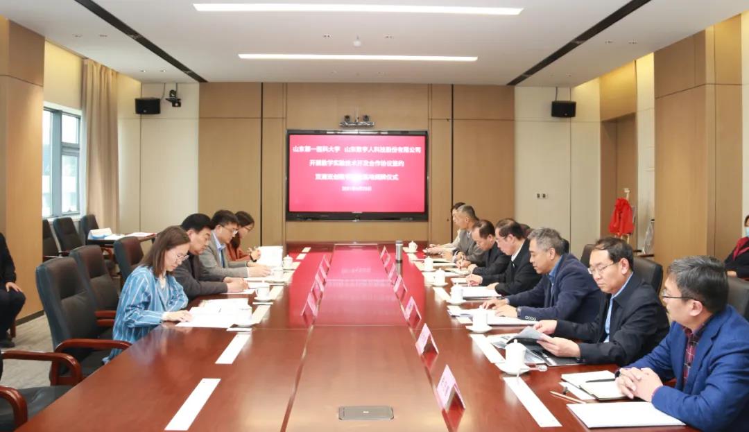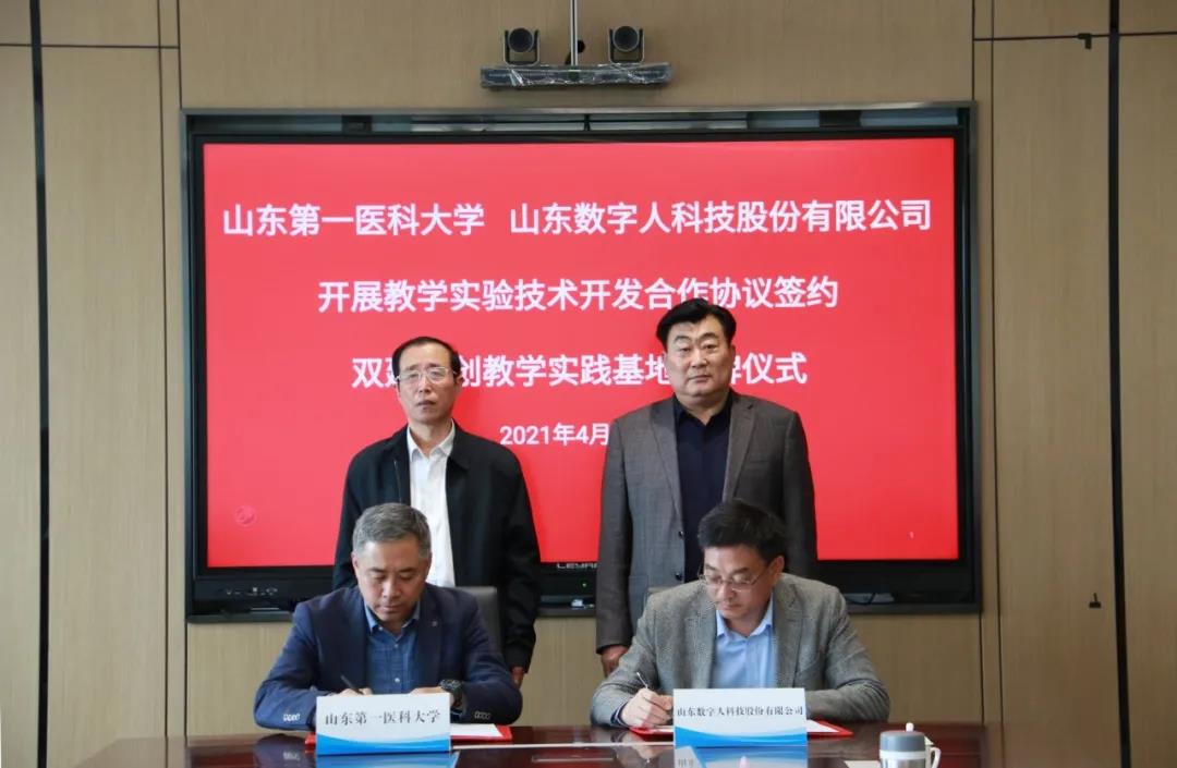 为进一步增强教学实验技术水平,创新高层次专业人才培养模式,加快推动产学研合作,4月22日,山东第一医科大学与山东数字人科技股份有限公司在济南主校区签署教学实验技术开发合作协议。山东第一医科大学(山东省医学科学院)党委常务副书记韩金祥、山东数字人科技股份有限公司董事长徐以发出席仪式并为“双建双创教学实践基地”揭牌。校(院)党委委员、副校(院)长王鹏程主持仪式。