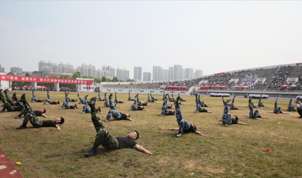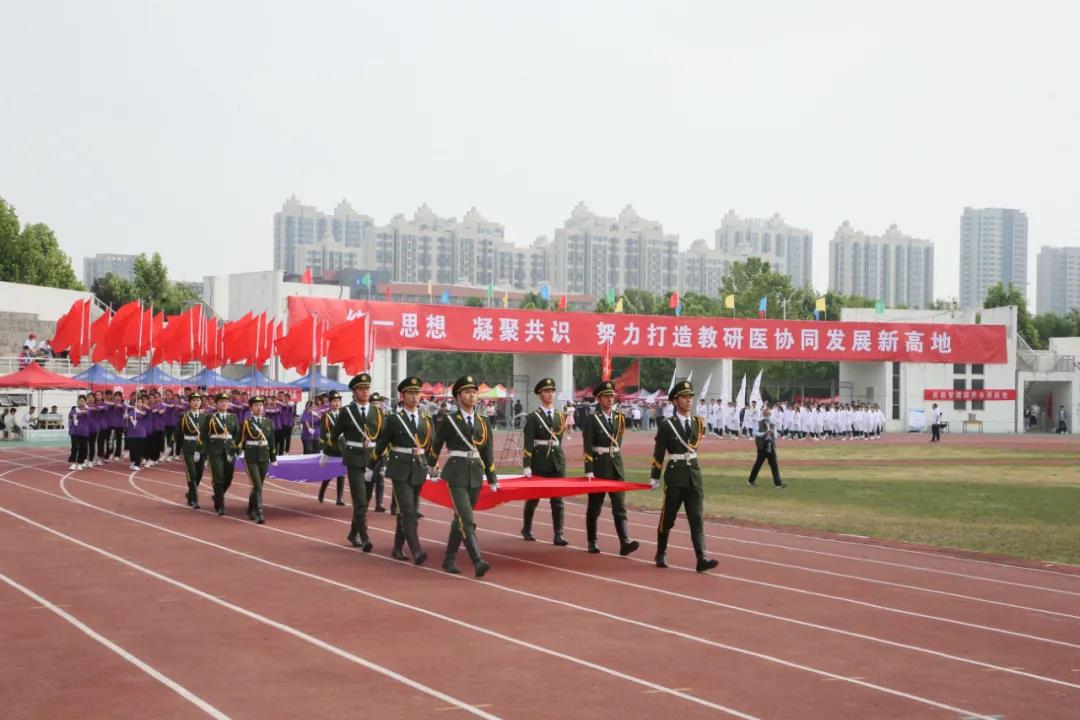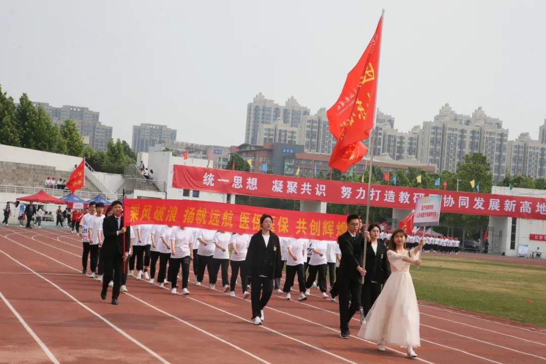 校(院)党委常务副书记韩金祥宣布运动会开幕;校(院)领导彭春雷、徐淑凤、刘太来、张福仁、姚庆强、王鹏程、吕晓黎出席大会;来自各附属医院、各教学机构、各部门的80支代表队参加比赛。
