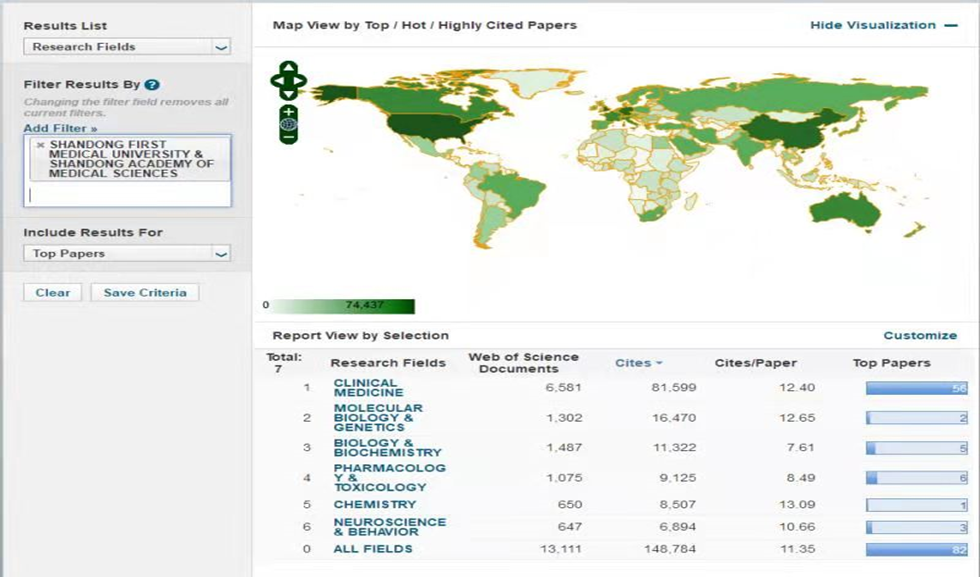 根据科睿唯安2021年7月公布的最新数据,校(院)ESI中国内地大学综合排名上升至第86位,山东省属医学院校第1位,全国独立设置的医学院校第14位。临床医学、药理学与毒理学、生物与生物化学、分子生物学与遗传学、化学、神经科学与行为科学等6个学科进入ESI排名全球前1%。自校(院)成立以来,ESI排名全球前1%学科实现了从1个到6个的发展奇迹,并展现了半年之内数量“翻番”的加速度。临床医学在全国高校排名第21位、独立设置的医学院校第9位,首次进入“前十”。