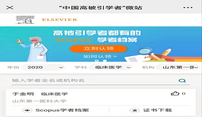 在爱思唯尔2020中国高被引学者排行榜中,于金明院士入选临床医学学科高被引学者。2021软科世界大学学术排名中,校(院)首次入围全球1000强,位列独立设置医学院校排名榜单第18位。