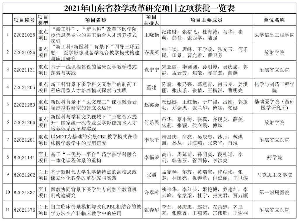 近日,山东省教育厅发布《关于公布2021年本科教学改革研究项目立项名单的通知》(鲁教高函〔2021〕43号),山东第一医科大学(山东省医学科学院)推荐申报的11个教学改革研究项目全部获批立项。其中,重点项目7项,面上项目4项,立项数量和质量均创历年新高。