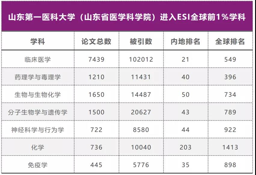 1月13日,科睿唯安公布了ESI的最新统计数据,山东第一医科大学(山东省医学科学院)免疫学学科进入ESI全球排名前1%。目前,校(院)已有7个学科进入ESI全球前1%,总数创历史新高,学科数量首次位居独立医学院校第10位(并列),综合排名位居ESI中国内地大学第86位,内地独立医学院校第14位。其中,临床医学学科位居内地排名21位、独立医学院校第9位。