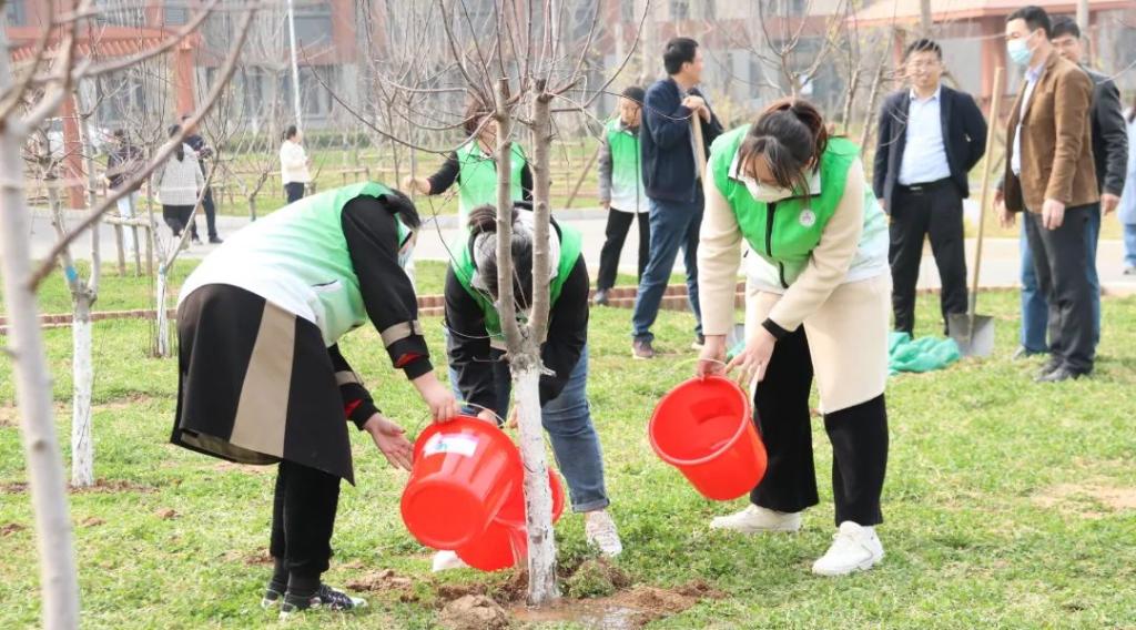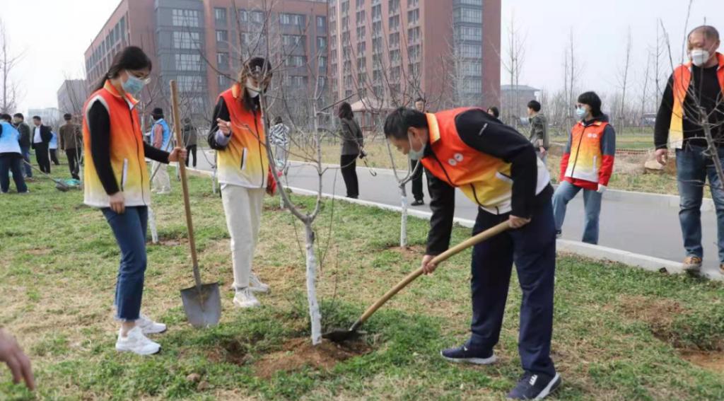 植树现场,校(院)领导与广大师生相互协作,挥锹培土、提水浇苗,栽下一棵棵海棠、花石榴、樱花等树苗。并与学生们交流学习情况,关心其日常生活,叮嘱他们当前要做好个人防护,勤奋学习,增长本领,积极参加公益实践活动,美化校园、爱护校园,倡导绿色低碳、文明健康的生活理念,追求健康向上的绿色生活方式。