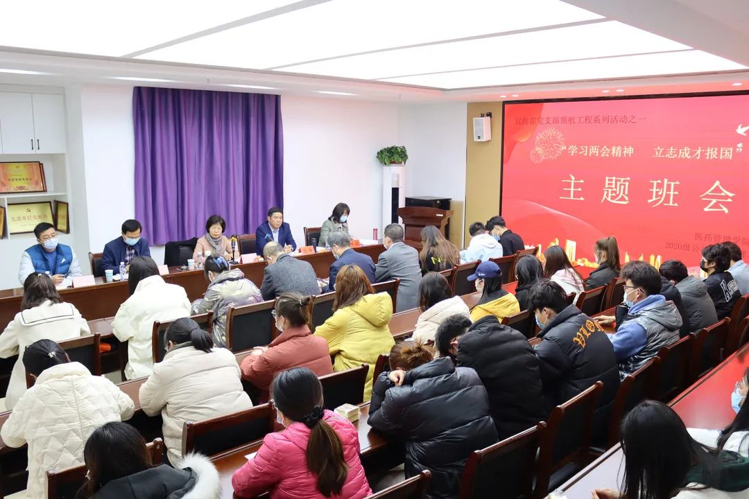 3月17日,校(院)党委副书记吕晓黎与所在宣传部党支部成员深入医药管理学院2020级公共事业管理本科1班,开展“领航工程”系列活动之“学习两会精神,立志成才报国”主题班会。吕晓黎作了题为《传承山一大精神,做新时代山一大的奋斗者》的报告,介绍了校(院)“领航工程”,从机遇和使命、开创和新局、历史和传承、做新时代山一大奋斗者等方面,介绍了校(院)基本情况、发展历程、重要进展,讲述了山一大历史上的代表性的功勋人物及其所蕴含的自强不息的精神追求和拚搏奉献的优秀品质,希望同学们自觉传承一代代山一大人共有的精神品质,初心不变,接续前行。结合习近平总书记给青年学生提出的“立大志、明大德、成大才、担大任”的要求 ,结合自身的阅历,对如何领悟要义、怎样贯彻到学习生活乃至今后人生的实践中,做了深入浅出的解读,寄语和勉励同学们立鸿鹄志、做奋斗者,努力成为祖国建设的栋梁之材,引起同学们的强烈共鸣。支部书记讲述了全国“两会”概况特别是校(院)“两会”代表在参会期间的提案亮点。同学们结合自身所学公共事业管理专业,围绕两会报告中所关注的高等教育发展、学科建设、学分制改革、困难大学生助学贷款、大学生职业生涯规划等问题作了交流发言;师生就公共卫生管理方向的学业深造和实践锻炼进行了互动交流。