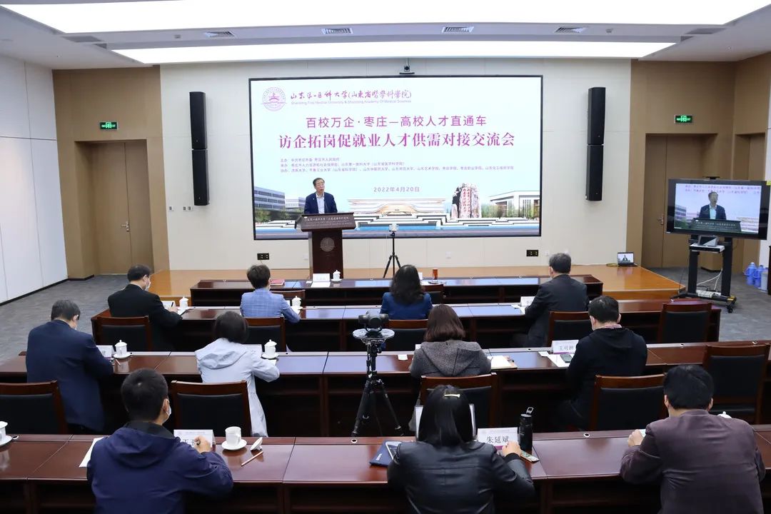 为深入贯彻中央、山东省人才工作会议精神,积极应对疫情对人才交流活动的不利影响,全力促进毕业生更加充分更高质量就业,中共枣庄市委、市政府联合山东第一医科大学(山东省医学科学院)、济南大学、齐鲁工业大学(山东省科学院)、山东中医药大学、山东师范大学等9所高校,举办2022年“百校万企•枣庄—高校人才直通车”云招聘活动。4月20日,云招聘活动启动仪式以线上形式召开,校(院)党委书记韩金祥,枣庄市委常委、市政府副市长李守江,枣庄市委组织部副部长、市人社局党组书记、局长尹作义出席会议并讲话,会议由校(院)党委委员、副校(院)长张贤雷主持。