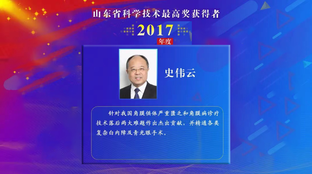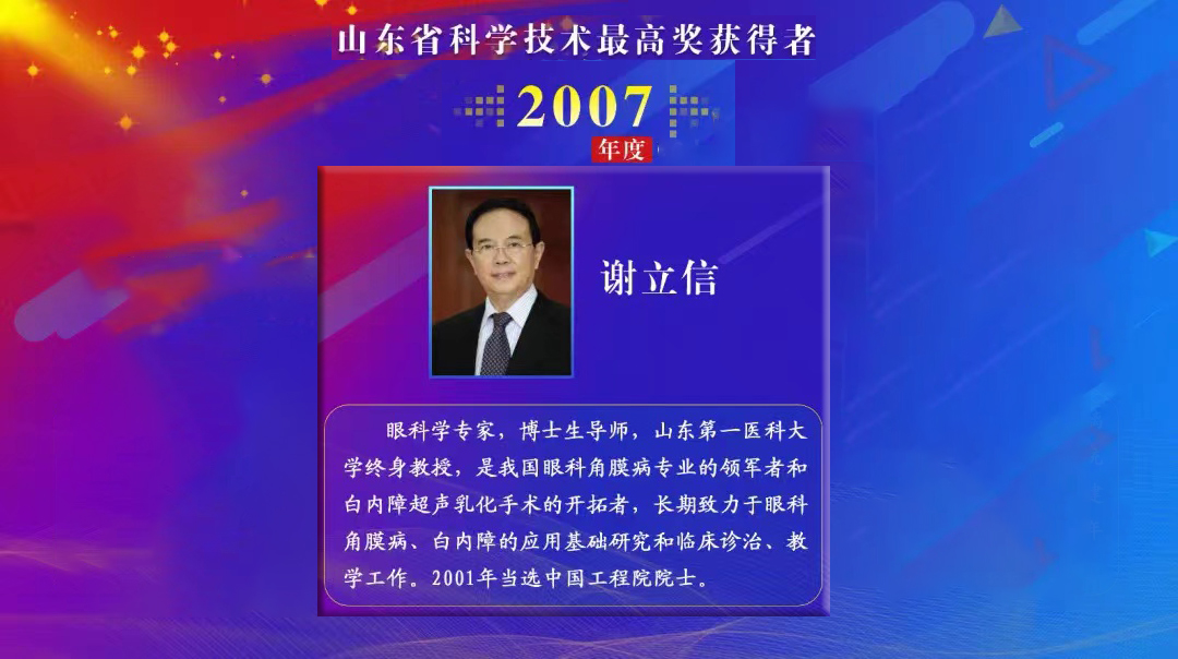 自该奖项设立以来,全省共有31人获得山东省科学技术最高奖。其中,山东第一医科大学(山东省医学科学院)4人获此殊荣,分别是中国工程院院士、附属眼科研究所(山东省眼科研究所、附属青岛眼科医院)名誉所长谢立信教授,中国工程院院士、名誉校(院)长、附属肿瘤医院(山东省肿瘤医院)院长于金明教授,副校(院)长、附属省立医院(山东省立医院)院长赵家军教授,附属眼科研究所(山东省眼科研究所、附属青岛眼科医院)所长史伟云教授。