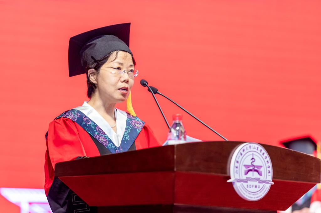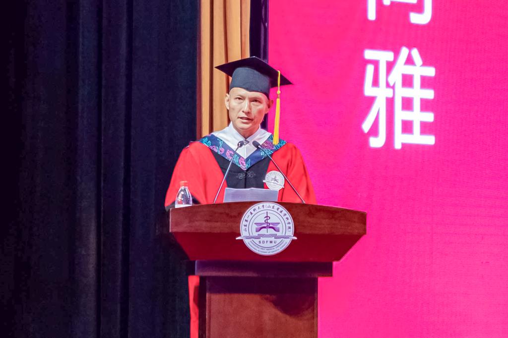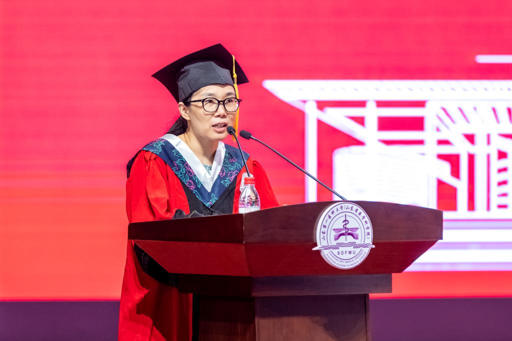 导师代表、长江学者特聘教授刘红在发言时对全体毕业生提出三点嘱托,一是勤而好学,坚持不懈;二是笃而行之,追求执着;三是保持纯真,初心不改。希望大家能够始终遵从行医之德,恪守济世之义,践行“跬步千里、止于至善”的山一大校训,让青春瑰丽绽放,让梦想自由翱翔。