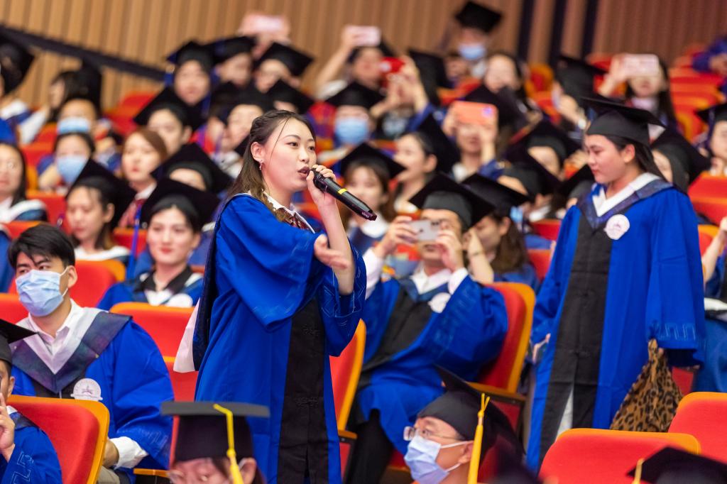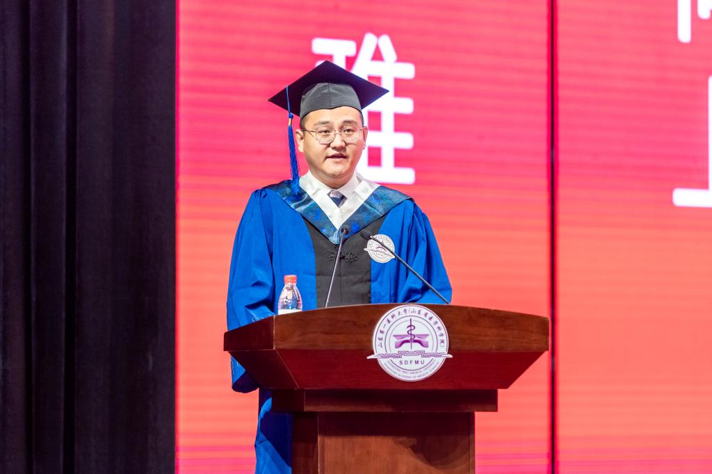 毕业研究生代表陈存宝在发言时代表2022届全体毕业生对学校领导和老师的辛勤培育表示衷心的感谢,并向母校、向恩师承诺:长路漫漫,不改初心,乘风破浪,不负使命,带着母校和恩师给予的给养,为人类的医疗健康事业贡献自己的力量。