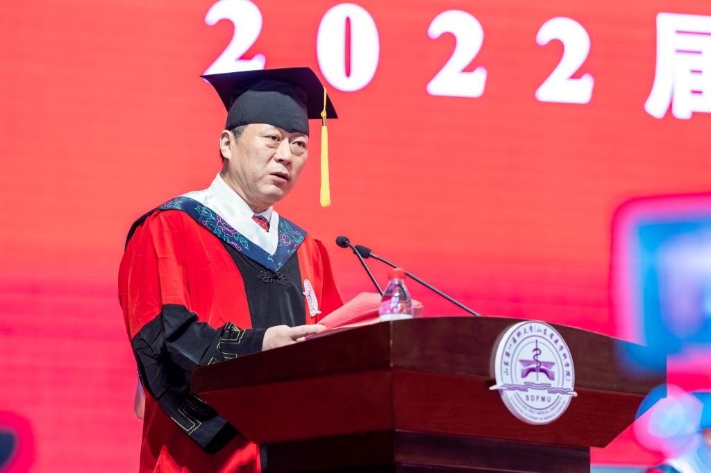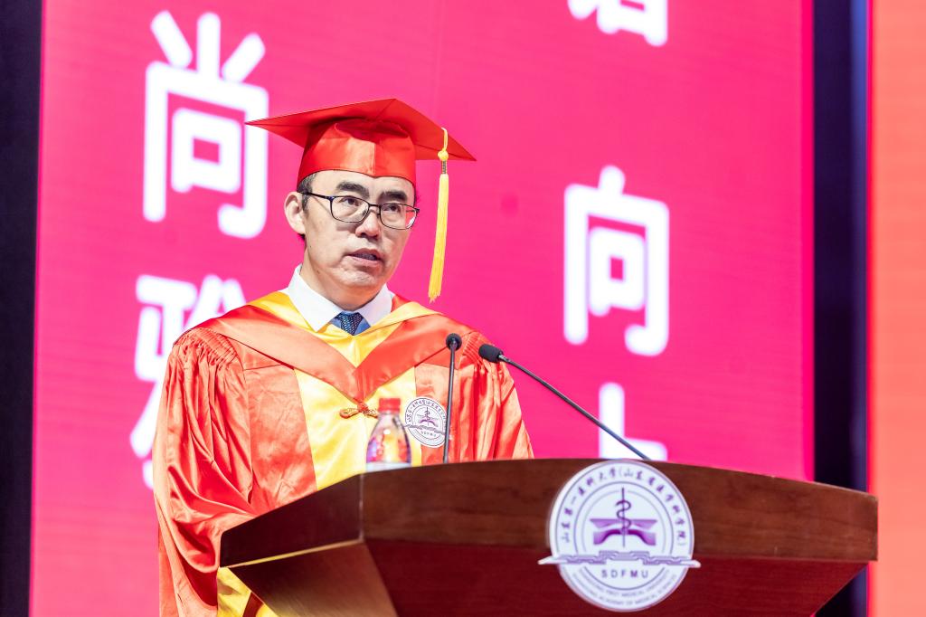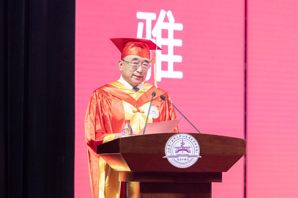 中国工程院院士、名誉校(院)长、附属肿瘤医院院长于金明在致辞中,寄语毕业生要坚定信念,永葆家国情怀,自觉把奋斗的脚步与国家发展的脉搏同频共振,把“敬畏生命、救死扶伤、甘于奉献、大爱无疆”行为准则和“人民至上、生命至上”自觉落实到行动中;要砥砺奋进,铸就青春底色,在孜孜不倦的学习中、在摸爬滚打的实践中练就过硬本领,做一名既有知识又有文化,自强自立的新时代青年;要开拓创新,树立科学的思维方式,积极投身到改革创新的滚滚浪潮中,与最快者赛跑,与最强者比拼,奋力书写“不负韶华、不负时代、不负人民”的青春华章。