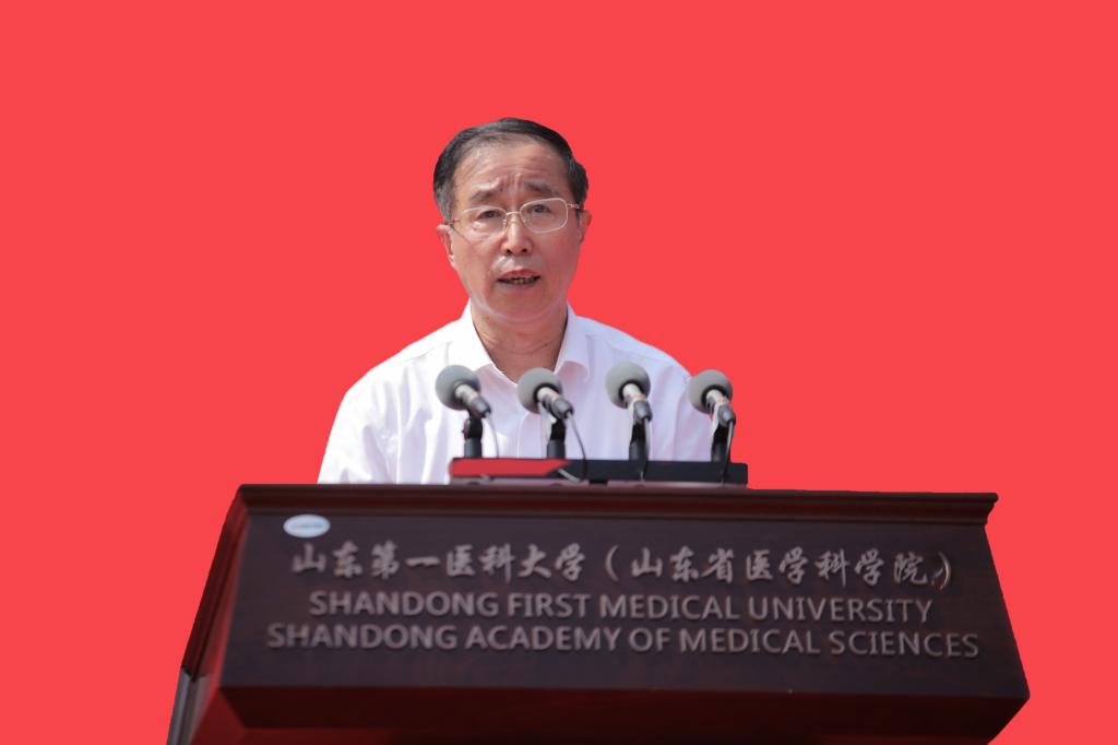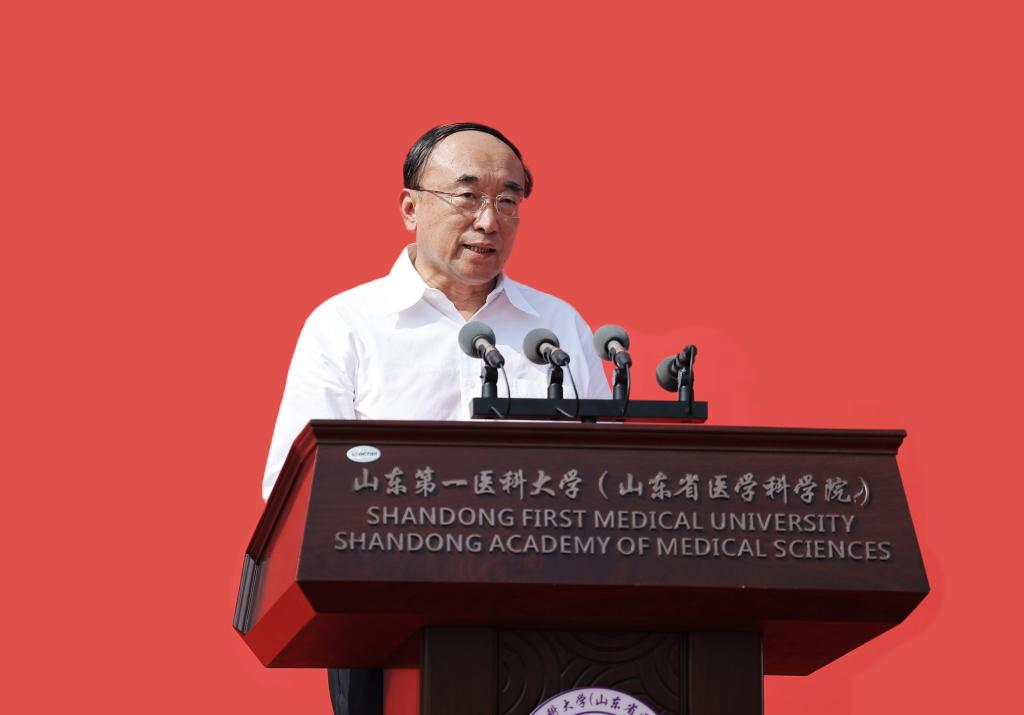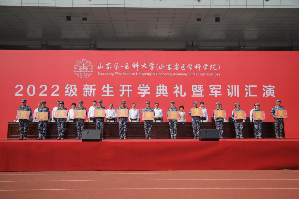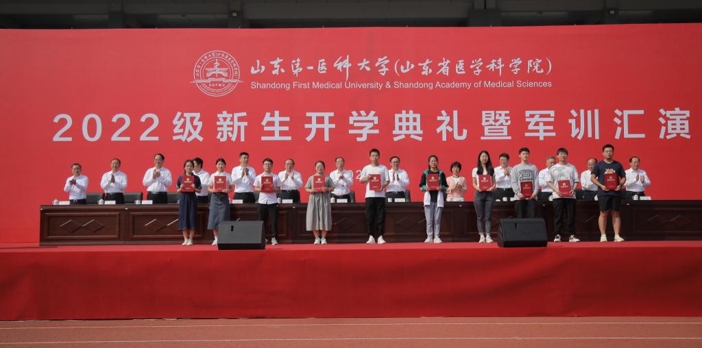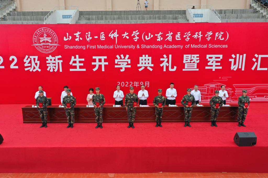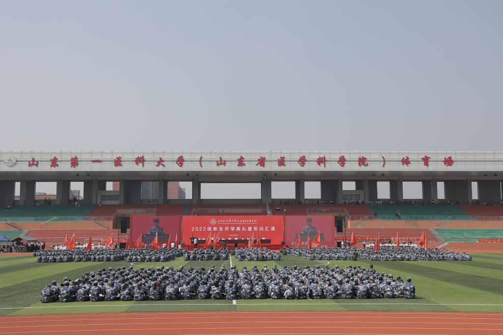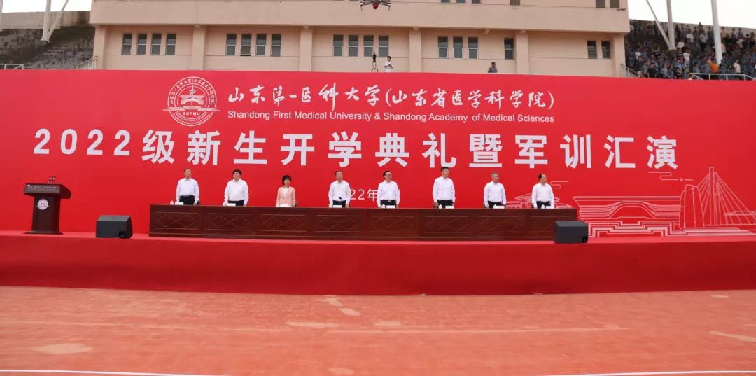 仲秋时节的山一大校园,天高云淡,军旗猎猎,军威雄壮。9月12日,山东第一医科大学(山东省医学科学院)2022级新生开学典礼暨军训汇报表演分别在济南主校区和泰安长城路校区体育场举行。校(院)党委书记韩金祥,中国科学院院士、校(院)长陆林,中国工程院院士、名誉校(院)长、附属肿瘤医院院长于金明,及校(院)领导吕晓黎、刘思金、赵家军、张福仁、王鹏程、刘东平、刘传勇、张贤雷、李栋、王宇轩出席典礼。