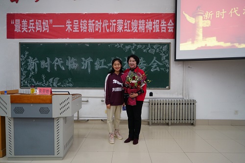 报告会上,结合自己艰苦的创业经历,朱呈镕讲述了她如何在沂蒙红嫂精神的激励下从下岗女工成长为有社会责任、有作为、有担当的企业家,以及克服困难,走万里边关,用实际行动展现拥军情怀的先进事迹。随后,她又为师生们讲述了战争岁月沂蒙红嫂和新时代红嫂爱军拥军的相关事迹。与会师生深深为沂蒙红嫂拥军爱党、无私奉献的先进事迹所吸引,现场气氛热烈,掌声频起,大家用双手释放着内心的激情和崇敬。报告会结束后,学生代表献花合照。