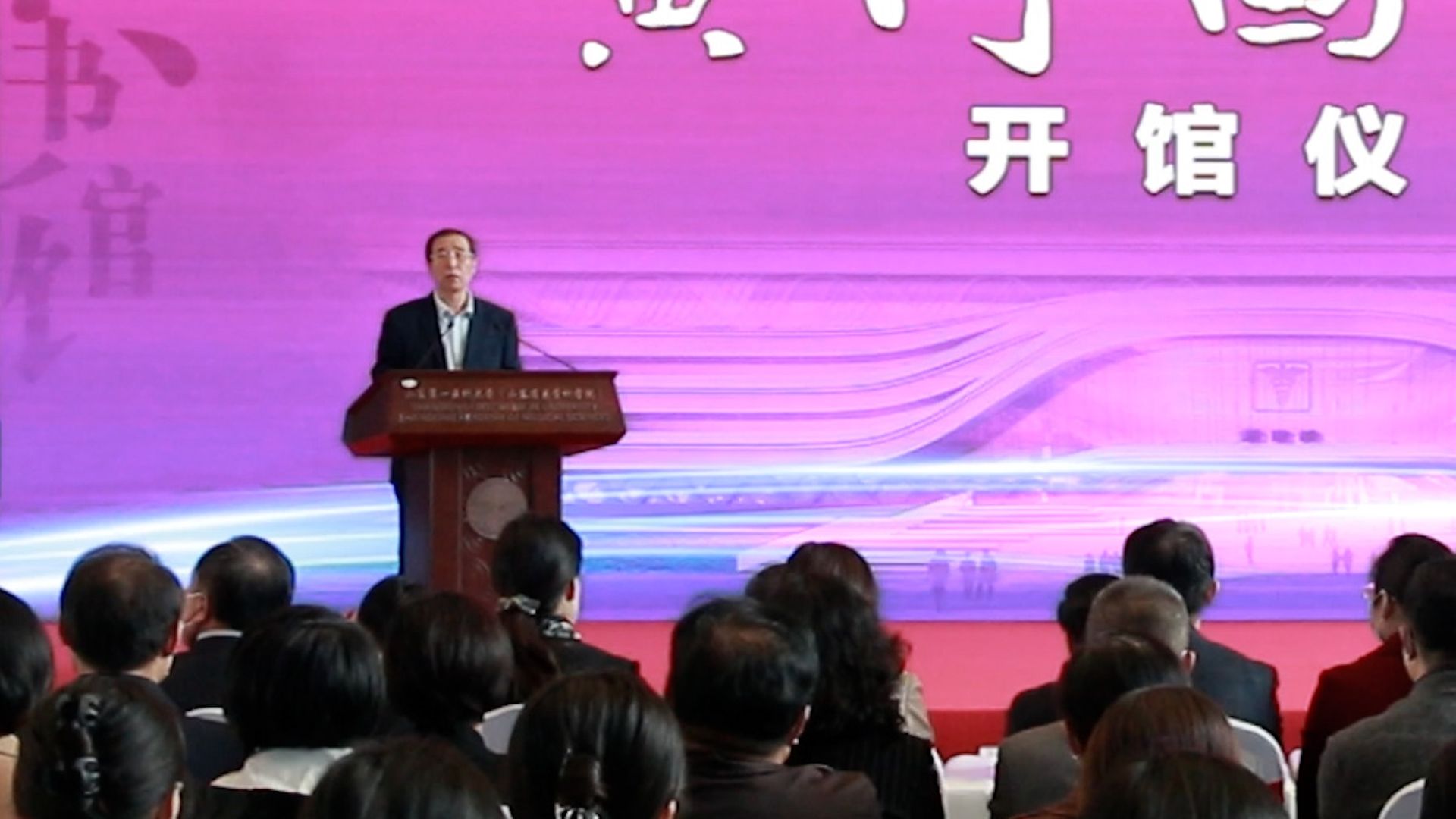 韩金祥在致辞中向莅临活动的领导、嘉宾表示热烈欢迎,向对黄河图书馆予以大力支持的省出版集团、省图书馆表示衷心感谢,向为黄河图书馆设计、建设和运行付出辛勤劳动的全体工作人员表示诚挚慰问。他简要回顾了校(院)成立三年多来取得的显著发展成就,指出高校图书馆不仅是高校办学的支柱条件之一,更是培育文化自信的重要场所。省出版传媒公司、省图书馆与校(院)签署战略合作协议是落实党的二十大精神的具体举措,对于推动校(院)争创“双一流”大学,对于推进书香山东建设,对于加快我省文化出版产业发展都具有重要意义。韩金祥向图书馆提出三点期望,一是坚持以服务师生为宗旨,打造校园文化新高地;二是坚持以传承文明为使命,打造弘扬优秀文化新高地;三是坚持以服务社会为导向,打造服务全民阅读新高地。他强调,要以黄河图书馆启用为契机,在全校大力涵育爱读书、读好书、善读书的浓厚氛围。广大师生医护员工要以书为伴、以书为友,在阅读中感知文化、荡涤浮躁、净化心灵、启发智慧,做到胸藏文墨怀若谷,腹有诗书气自华。