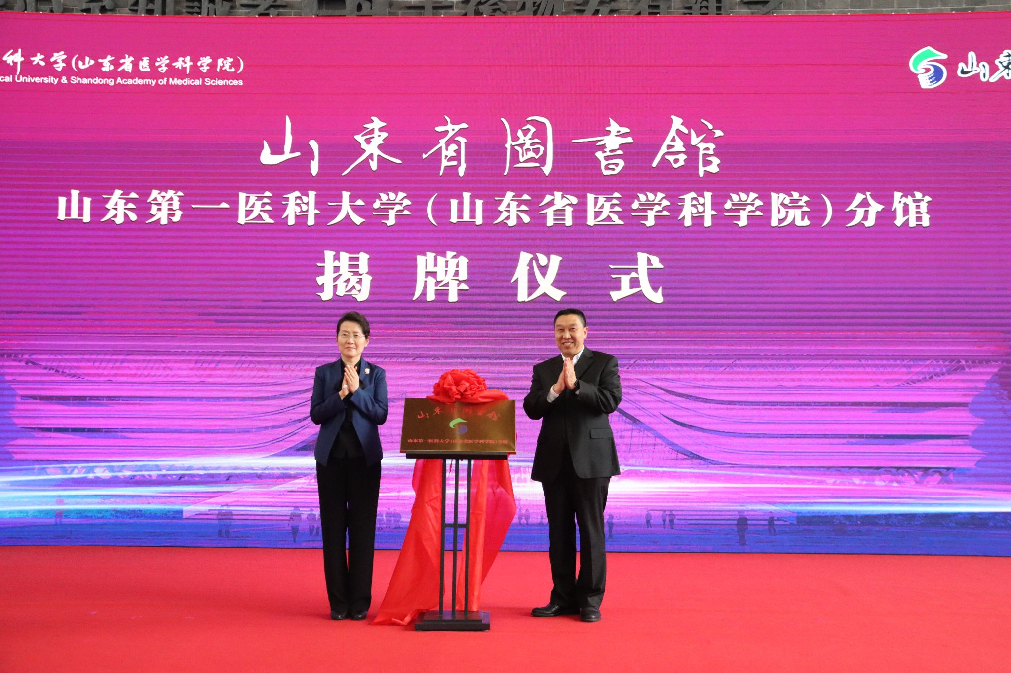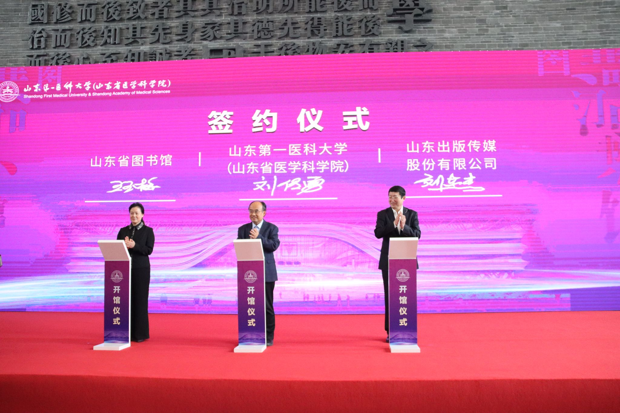 开馆仪式上,王磊、仲红波共同为山东省图书馆山东第一医科大学(山东省医学科学院)分馆揭牌。刘传勇、刘东杰、王玉梅分别代表校(院)、山东出版传媒股份有限公司、山东省图书馆签订合作协议。