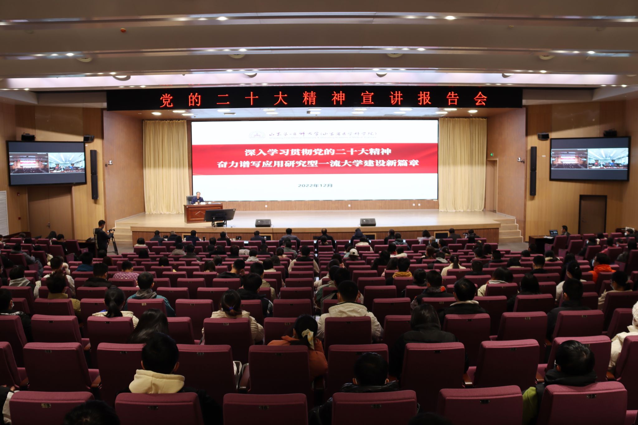 12月4日,校(院)学习贯彻党的二十大精神宣讲团团长、党委书记韩金祥以《深入学习贯彻党的二十大精神 奋力谱写应用研究型一流大学建设新篇章》为题,为校(院)广大干部师生作党的二十大精神宣讲报告。韩金祥从深刻学习领会党的二十大主题和主要成果、过去5年的工作和新时代10年的伟大变革、马克思主义中国化时代化、中国式现代化、全面建设社会主义现代化国家的目标任务、坚持党的全面领导和全面从严治党、应对风险挑战等七个方面,对党的二十大精神进行了深入的解读,并结合校(院)实际,就深入贯彻落实“办好人民满意的教育”,“加快建设中国特色、世界一流的大学和优势学科”,对标一流,分析形势,总结经验,提出以党的二十大精神为指引,加快建设应用研究型一流大学的整体方案和具体措施。