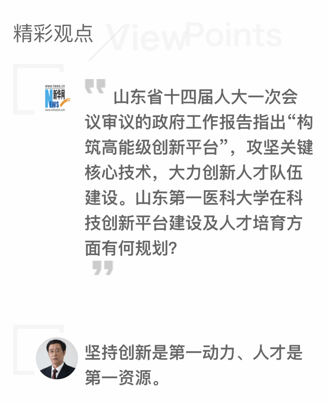 省人大代表韩金祥表示,大会以后,将严格按政府工作报告的要求,更加重视人才的“引”“育”,为山东省“2+N”人才集聚雁阵格局形成,贡献山东第一医科大学力量。