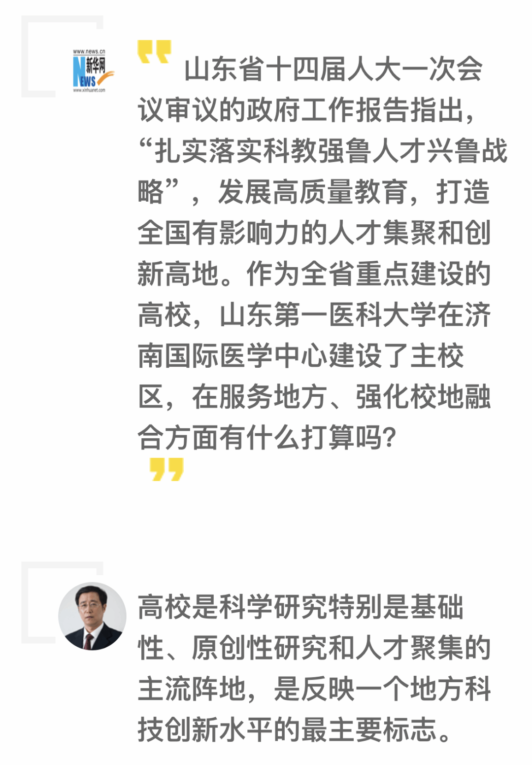 山东省十四届人大一次会议开幕后,省人大代表、校(院)党委书记韩金祥热议省政府工作报告,山东广播电视台对其进行了采访。通过一个短片,了解韩金祥代表在热议中聚焦了哪些方面?