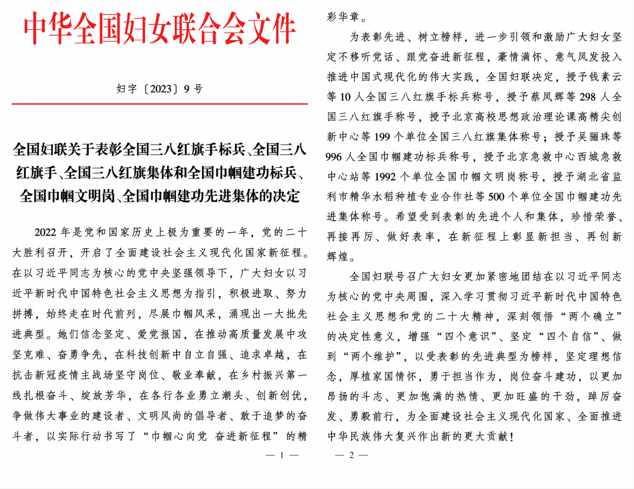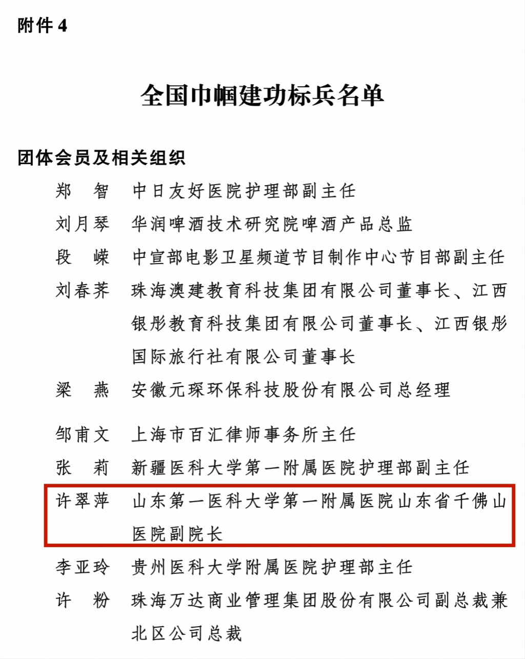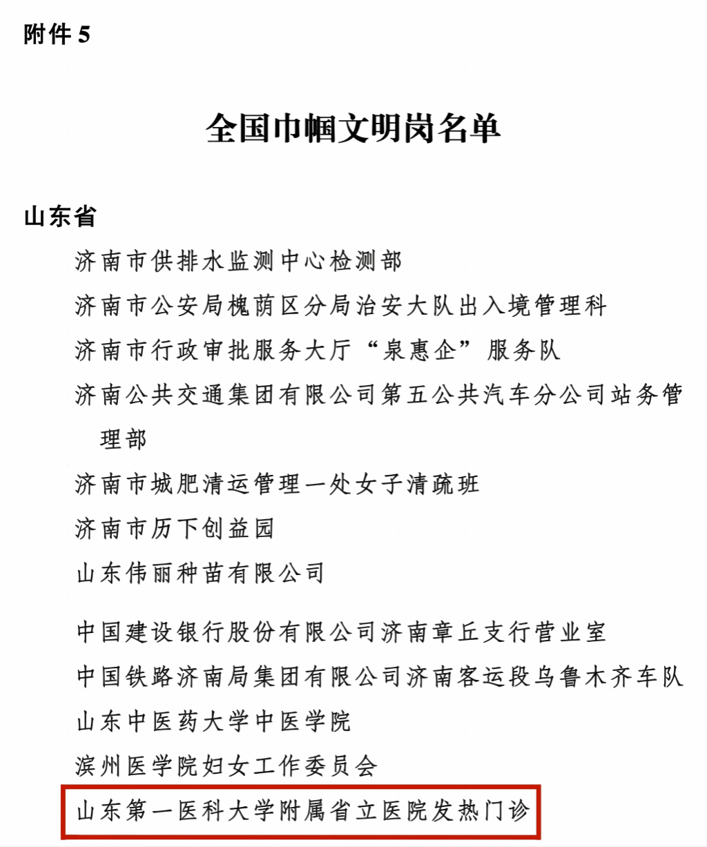 近日,中华全国妇女联合会发布《关于表彰全国三八红旗手标兵、全国三八红旗手、全国三八红旗集体和全国巾帼建功标兵、全国巾帼文明岗、全国巾帼建功先进集体的决定》,山东第一医科大学第一附属医院(山东省千佛山医院)副院长许翠萍获评“全国巾帼建功标兵”,附属省立医院(山东省立医院)发热门诊获评“全国巾帼文明岗”。