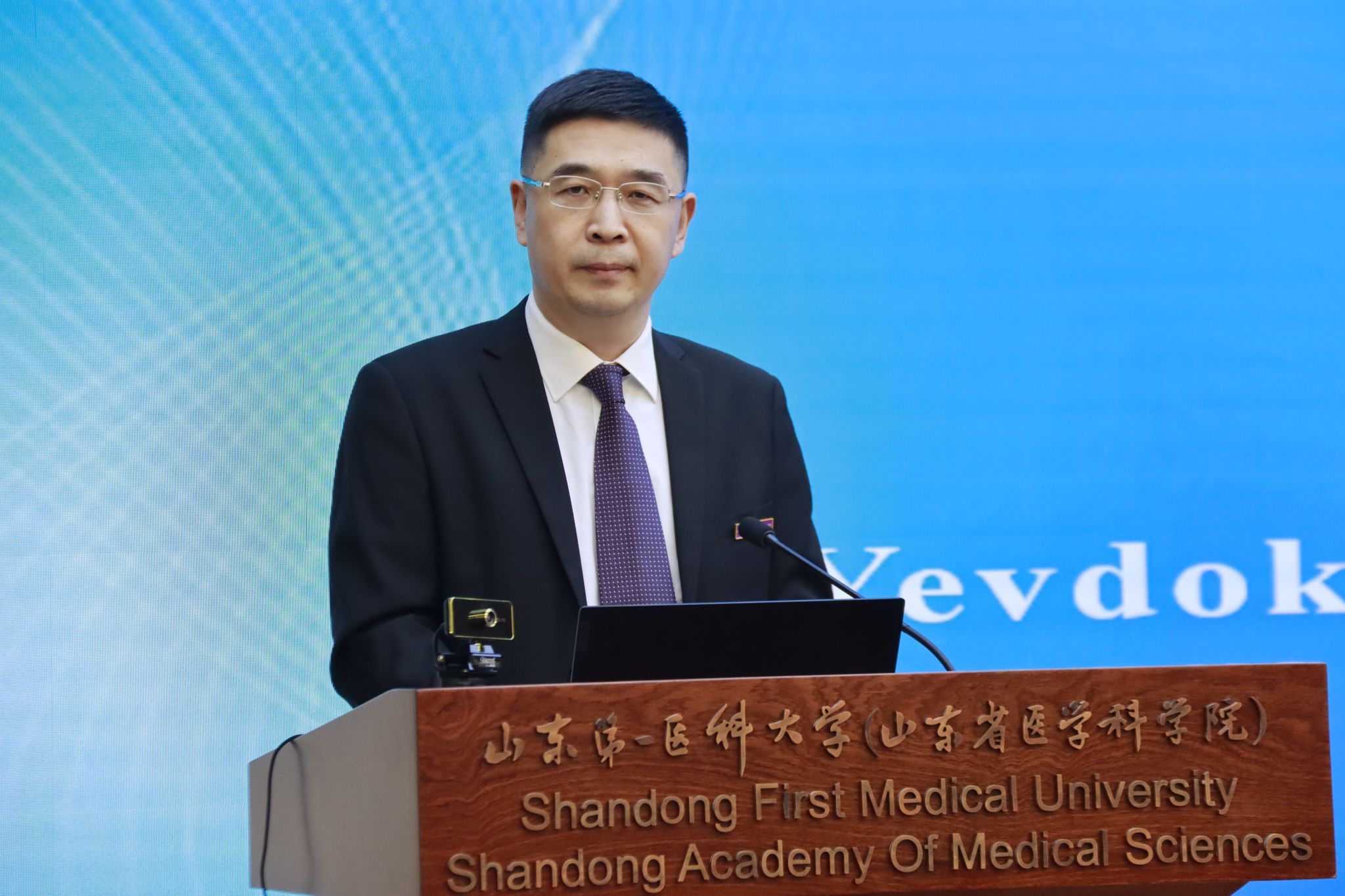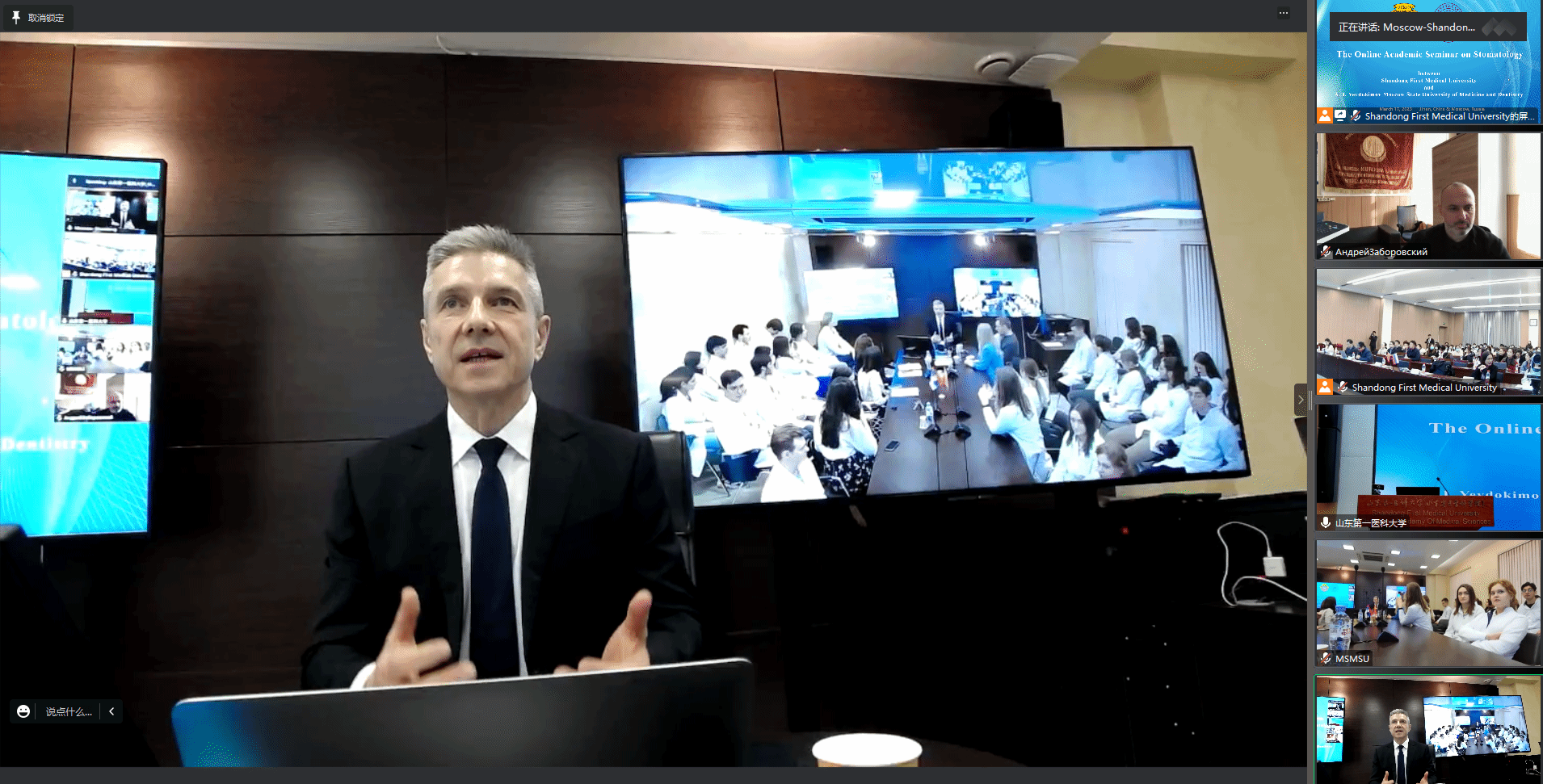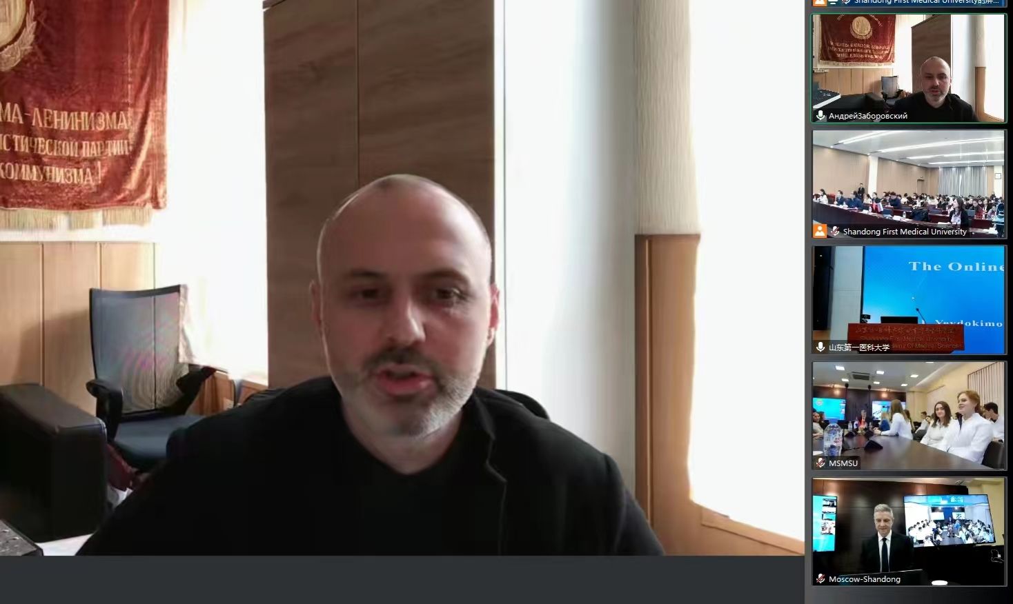 Andrew Zaborovsky在致辞中表示,莫斯科国立口腔医科大学非常重视与山东第一医科大学的学术交流与合作,希望双方定期召开学术研讨会分享口腔医学领域的经验,提高医学人才培养质量,提升医学科研水平。