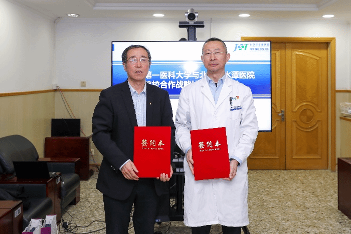 在北京积水潭医院,韩金祥与医院院长蒋协远代表双方签署了校院合作战略协议,医院党委书记李玉梅为韩金祥颁发了特聘客座教授证书。双方本着“优势互补、资源共享、合作共赢”的原则,就合作建立本硕博人才培养机制、科研合作机制,以及多种形式的资源共享机制等进行了座谈交流。