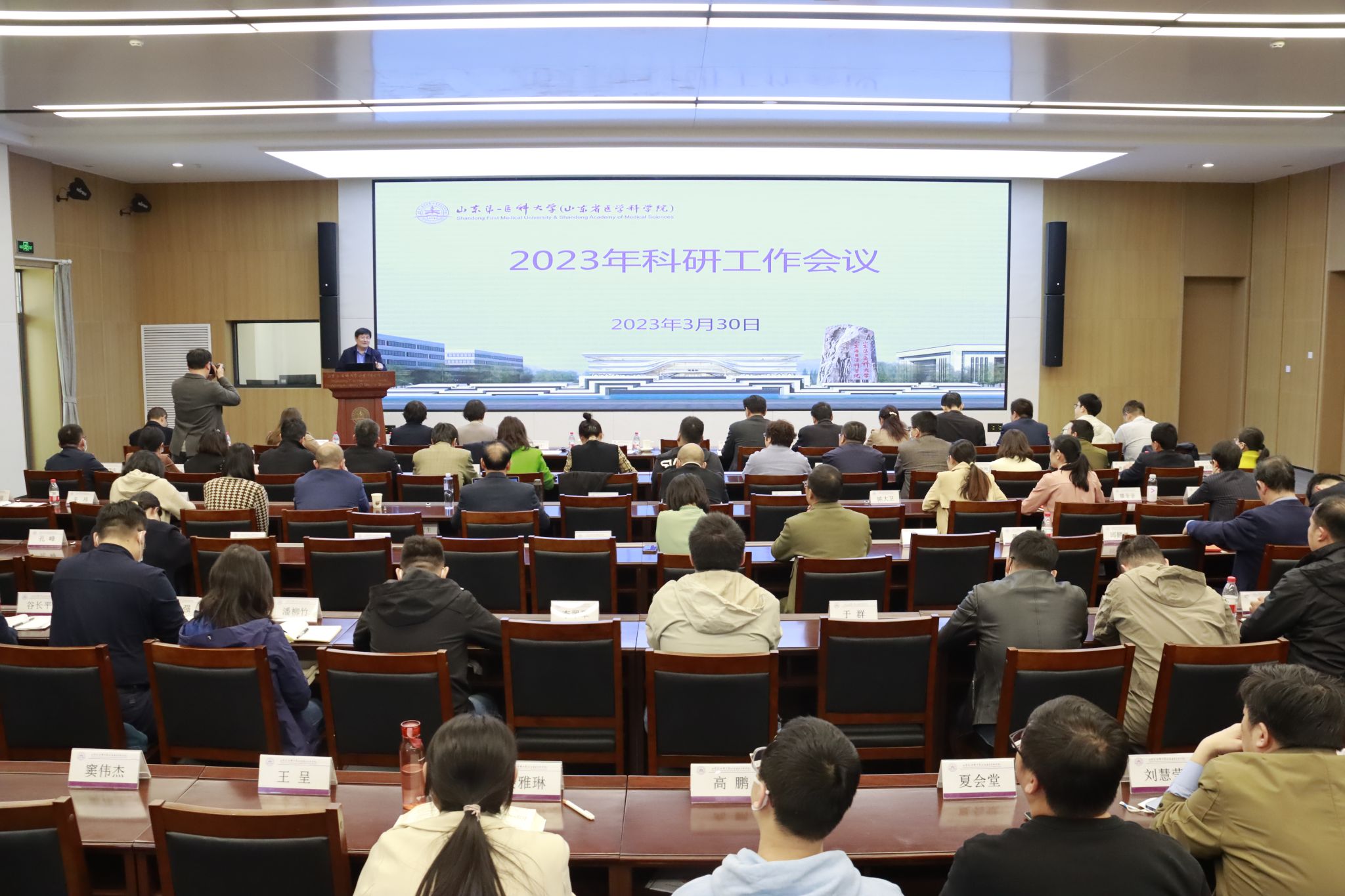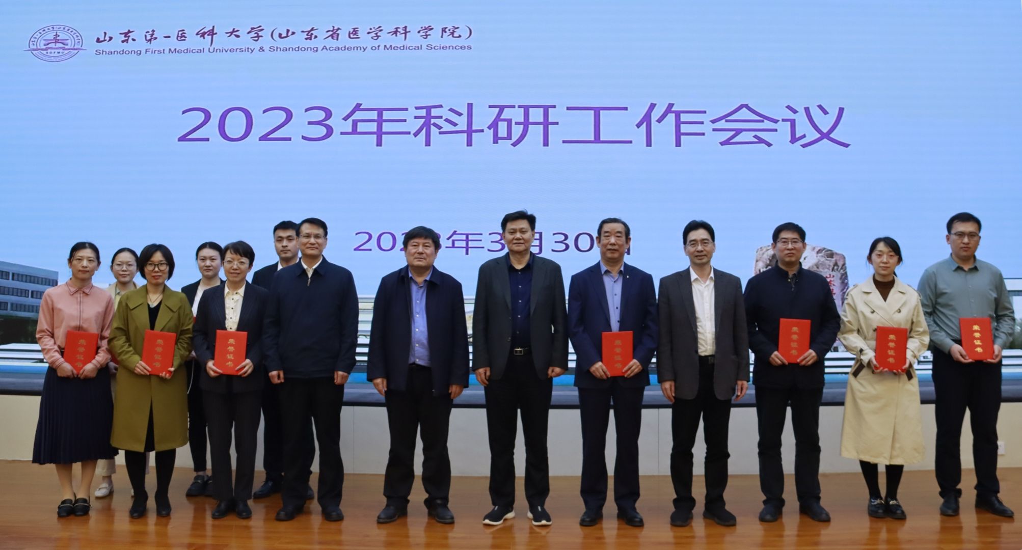 为进一步贯彻落实全国和山东省科技工作会议精神,全面提升校(院)科研质量,3月30日下午,校(院)召开2023年科研工作会议。省卫生健康委二级巡视员、科技教育处处长刘桂刚,省教育厅科学技术处处长曾宪文,省科技厅基础研究处处长王钟伟到会指导。校(院)党委委员、副校(院)长张福仁出席会议并讲话。