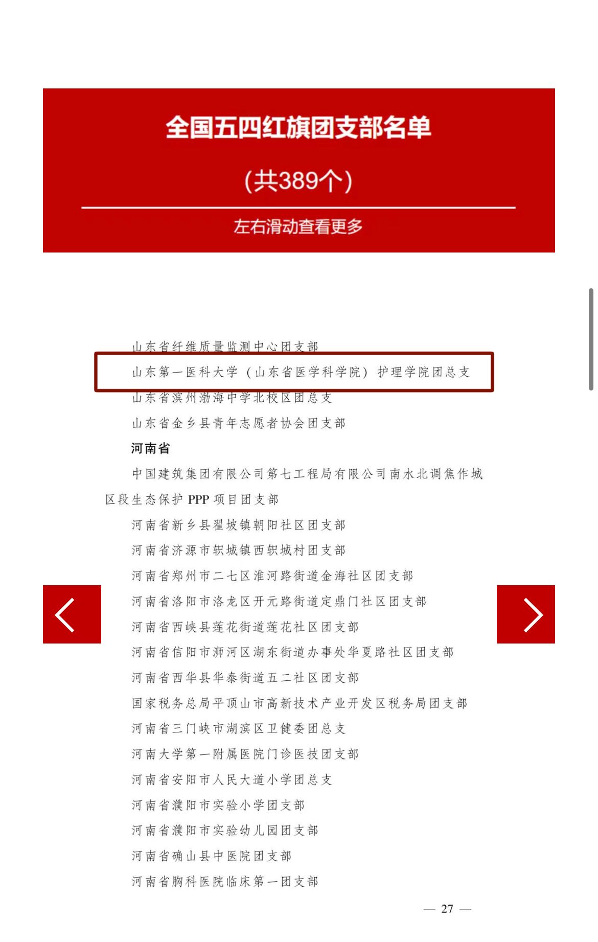 近日,共青团中央下发《关于表彰全国五四红旗团委(团支部)、全国优秀共青团员、全国优秀共青团干部的决定》,山东第一医科大学(山东省医学科学院)护理学院团总支荣获“全国五四红旗团支部”称号。护理学院团总支是全省高等教育系统唯一获此殊荣的基层团组织,实现了校(院)共青团工作的新突破。