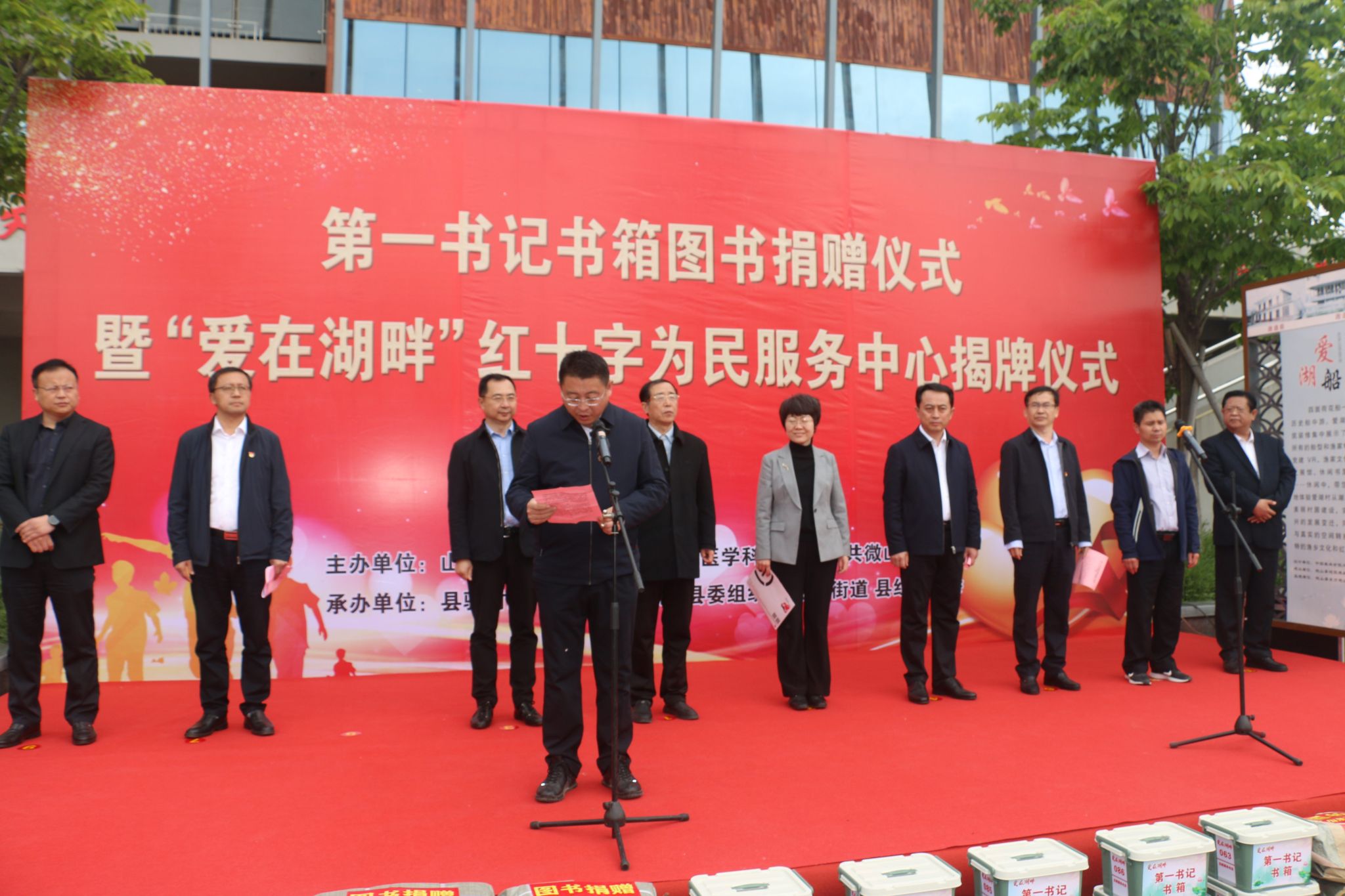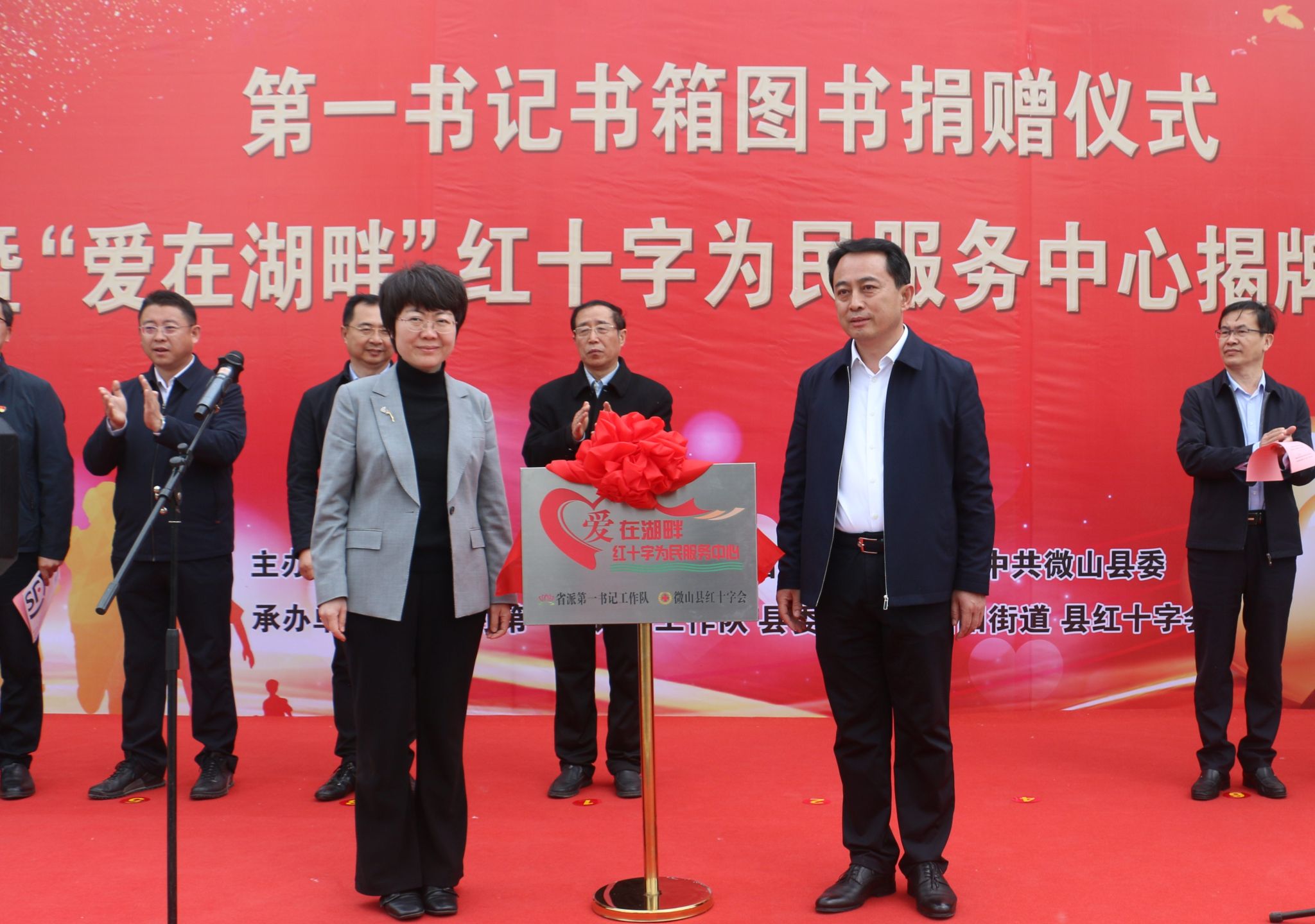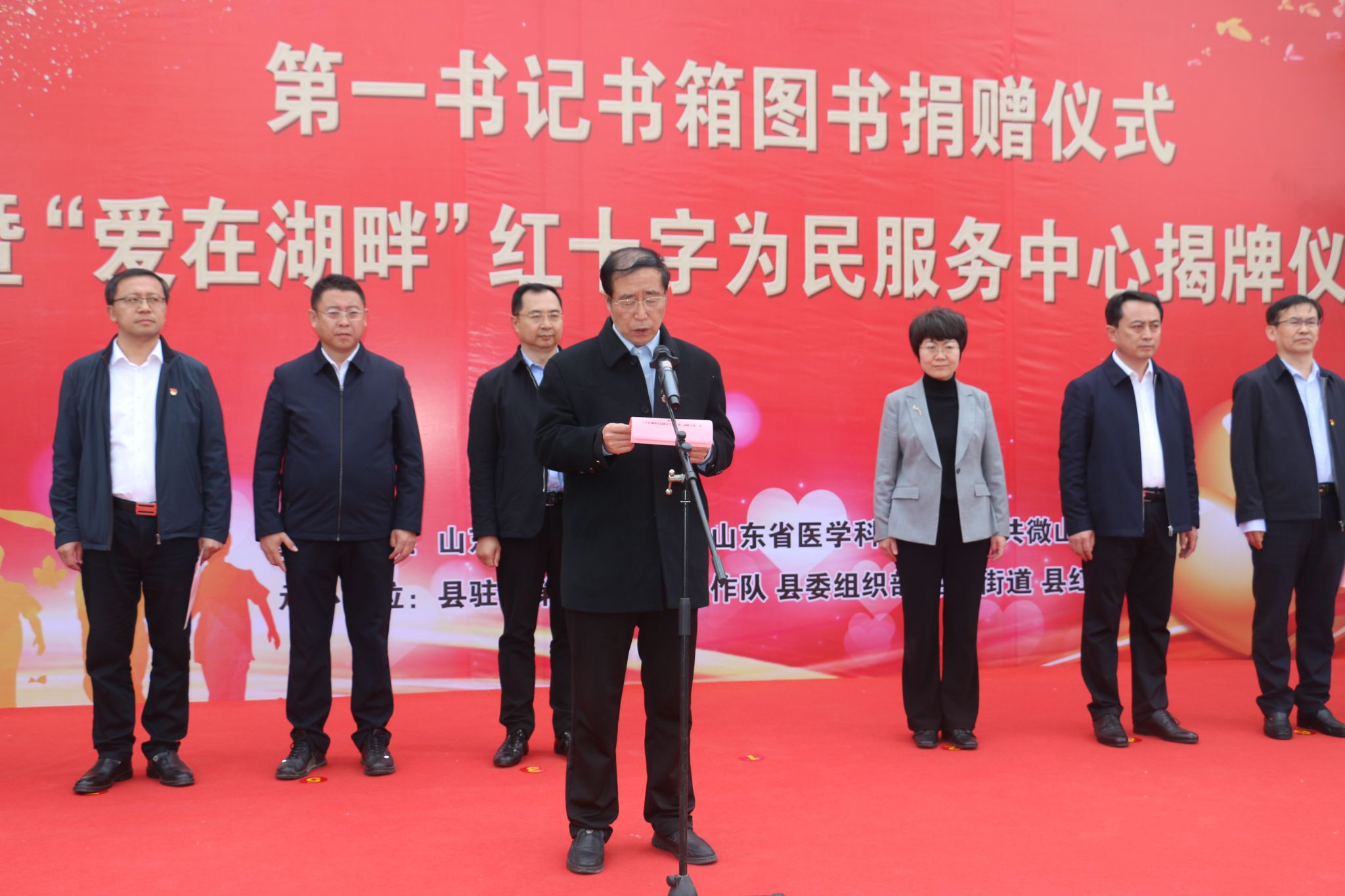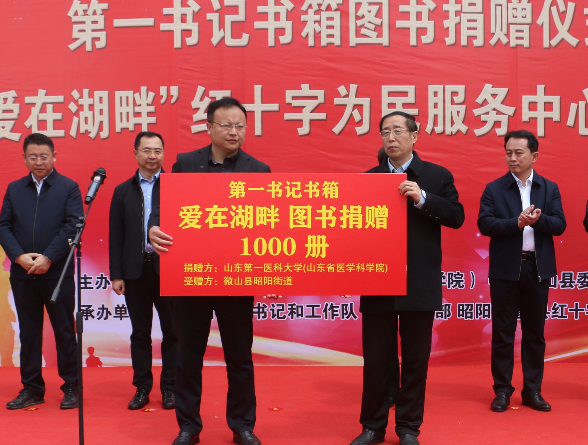 4月25日,由山东第一医科大学(山东省医学科学院)、微山县主办的第一书记书箱图书捐赠暨“爱在湖畔”红十字为民服务中心揭牌仪式在昭阳街道爱湖村举行。校(院)党委书记韩金祥,微山县委书记李勇出席仪式并致辞。校(院)党委委员、组织部部长、山东省红十字会副会长(兼职)安琨,济宁市红十字会党组书记、常务副会长周庆华出席仪式。微山县委副书记(挂职)、县工作专班主任吴兴波主持仪式。