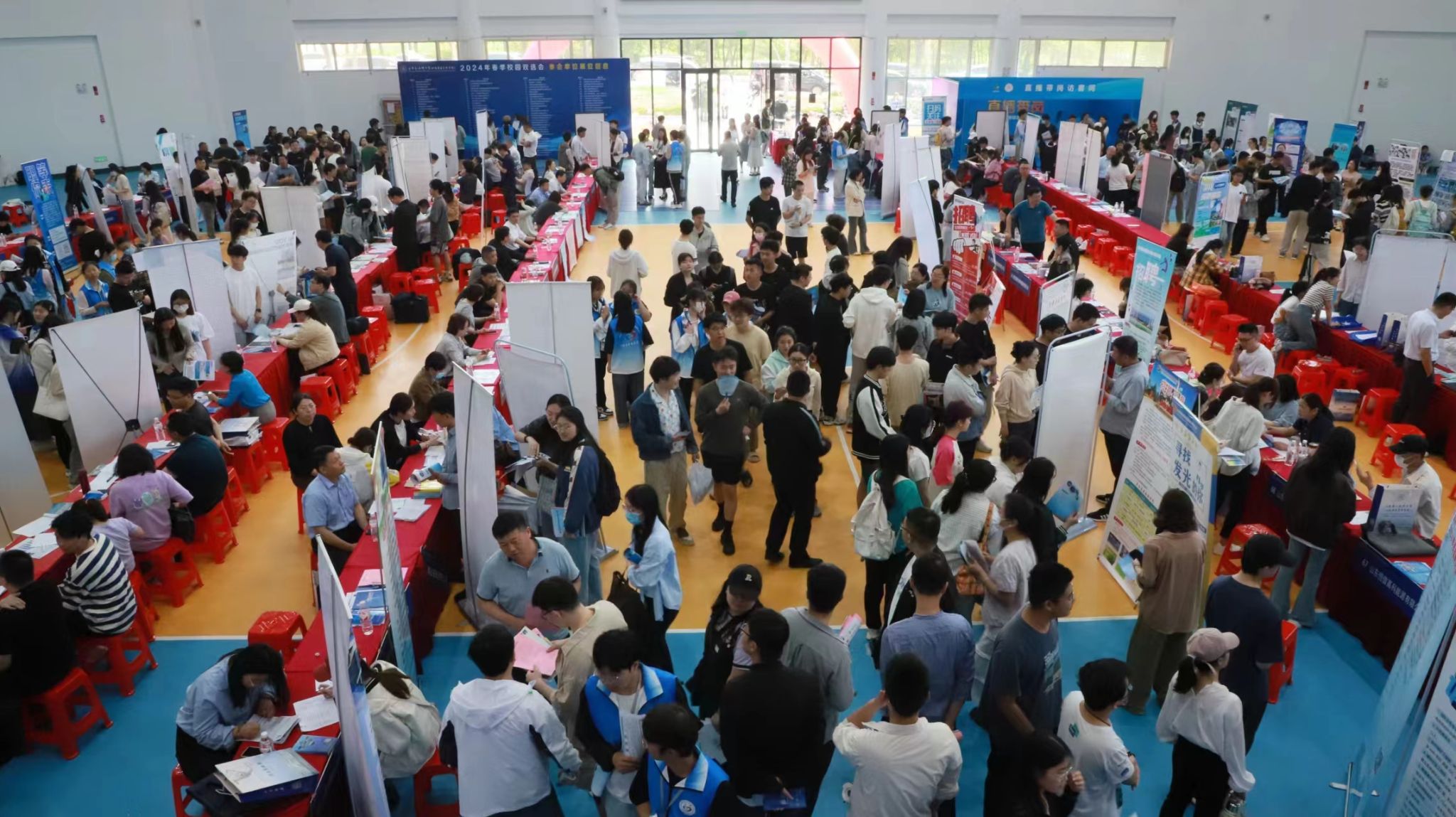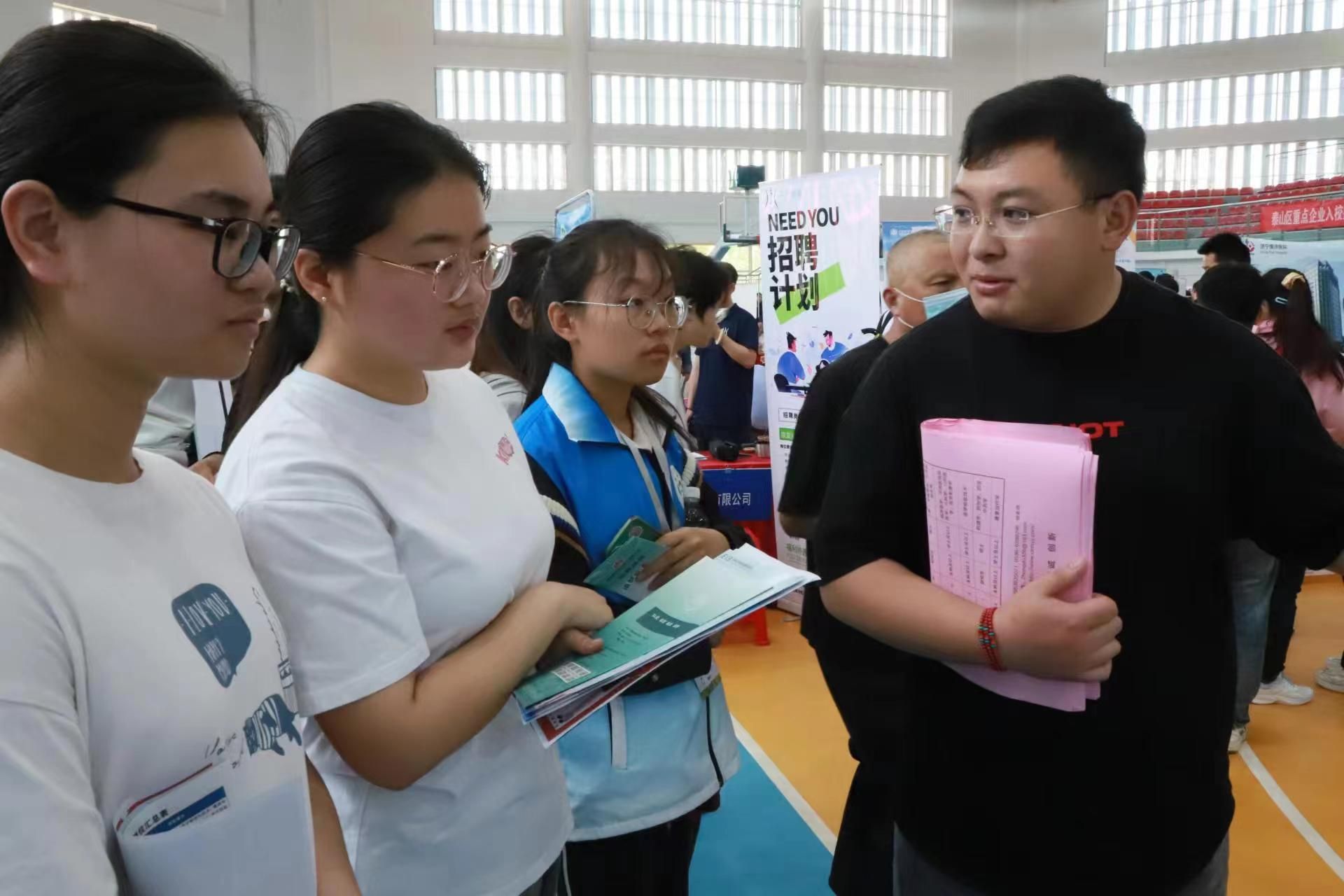 双选会现场各项工作有序开展,毕业生们驻足在招聘单位的展板前积极与招聘单位人员沟通交流,选择适合自己的岗位,用人单位热情地为前来咨询的学生解答疑惑。此次活动设置了就业赋能服务区,包括大学生应征入伍政策解答处、为学生提供兼具个性化和科技感的“人工智能简历优化实验室”。会场同期开展“求职领航 梦想启航”领航工程活动,山东教育电视台《职面未来》直播带岗活动,直播平台在线观看人数达9.6万余人。