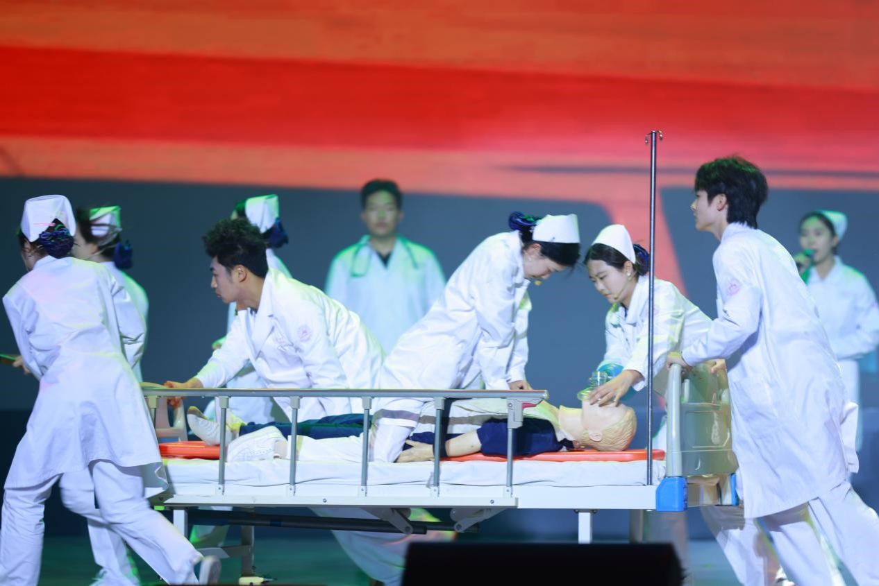 晚会以“赓续青春志,提灯启新程”为主题,分“心怀炽热·绘梦”“继往开来·守梦”“踔厉奋发·筑梦”“踏歌远航·圆梦”四卷徐徐展开。歌伴舞《上春山》展现出护理工作者昂扬向上、奋发有为“追光者”的青春面貌;走秀《魅力天使 星耀舞台——护士职装秀》,走出了护理工作者的自信昂扬;舞蹈《跃马高歌》凝聚着医护人员攀高峰、创佳绩、砥砺前行谱新篇的自信和雄心;情景剧《生死时速》歌颂了医护人员与死神赛跑、甘于奉献的勇气与决心;合唱《我爱你中国》诉说着华夏儿女心中永不褪色的赤诚爱国情;戏曲《樊梨花》让师生感受到了传统戏曲文化的时代魅力……晚会在师生大合唱《大梦想家》中画上圆满句号。