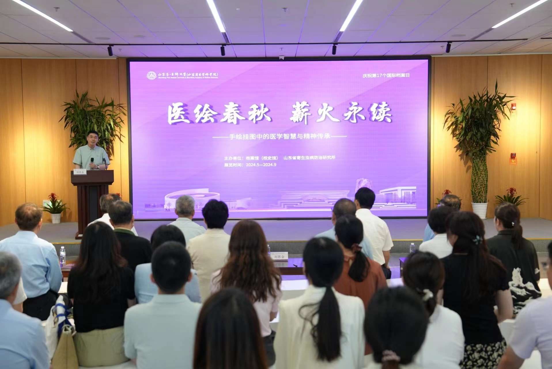 5月30日,为充分发挥校(院)档案存史资政育人作用,更好地传承校(院)优秀文化基因,弘扬“自强不息”校(院)精神,在第17个国际档案日来临之际,由档案馆(校史馆)、山东省寄生虫病防治研究所联合主办的“医绘春秋 薪火永续——手绘挂图中的医学智慧与精神传承”挂图展,在黄河图书馆文化活动展厅举办开展仪式。校(院)党委书记刘思金出席仪式并讲话,副校(院)长刘传勇主持仪式,校(院)领导王鹏程、路绪剑、王宇轩参加活动。