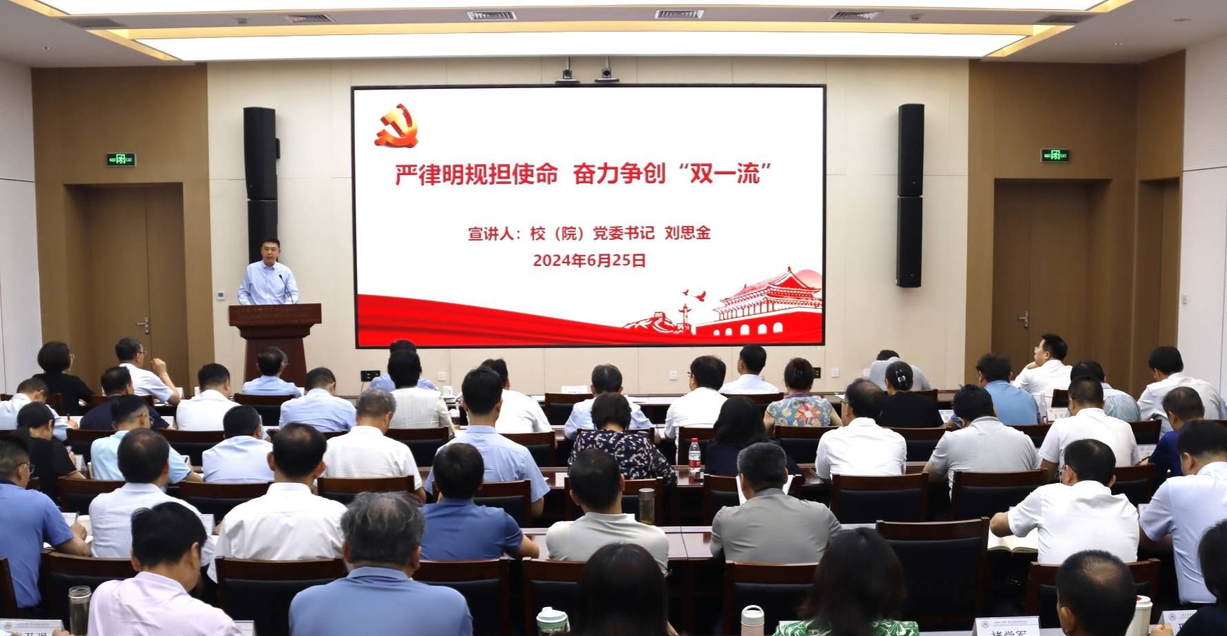 6月25日,校(院)举办党纪学习教育专题党课暨警示教育会,深入学习贯彻习近平总书记关于全面加强党的纪律建设的重要论述,深化以案说德、以案说纪、以案说法、以案说责,切实增强党员干部纪律规矩意识,推进党纪学习教育走深走实。校(院)党委书记刘思金以“严律明规担使命,奋力争创‘双一流’”为题,讲党纪学习教育专题党课并作警示教育,深刻剖析了违纪典型案例。